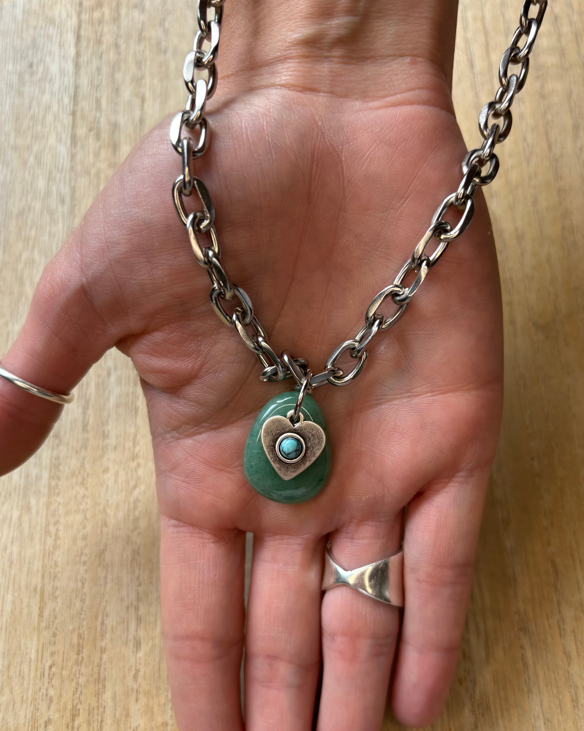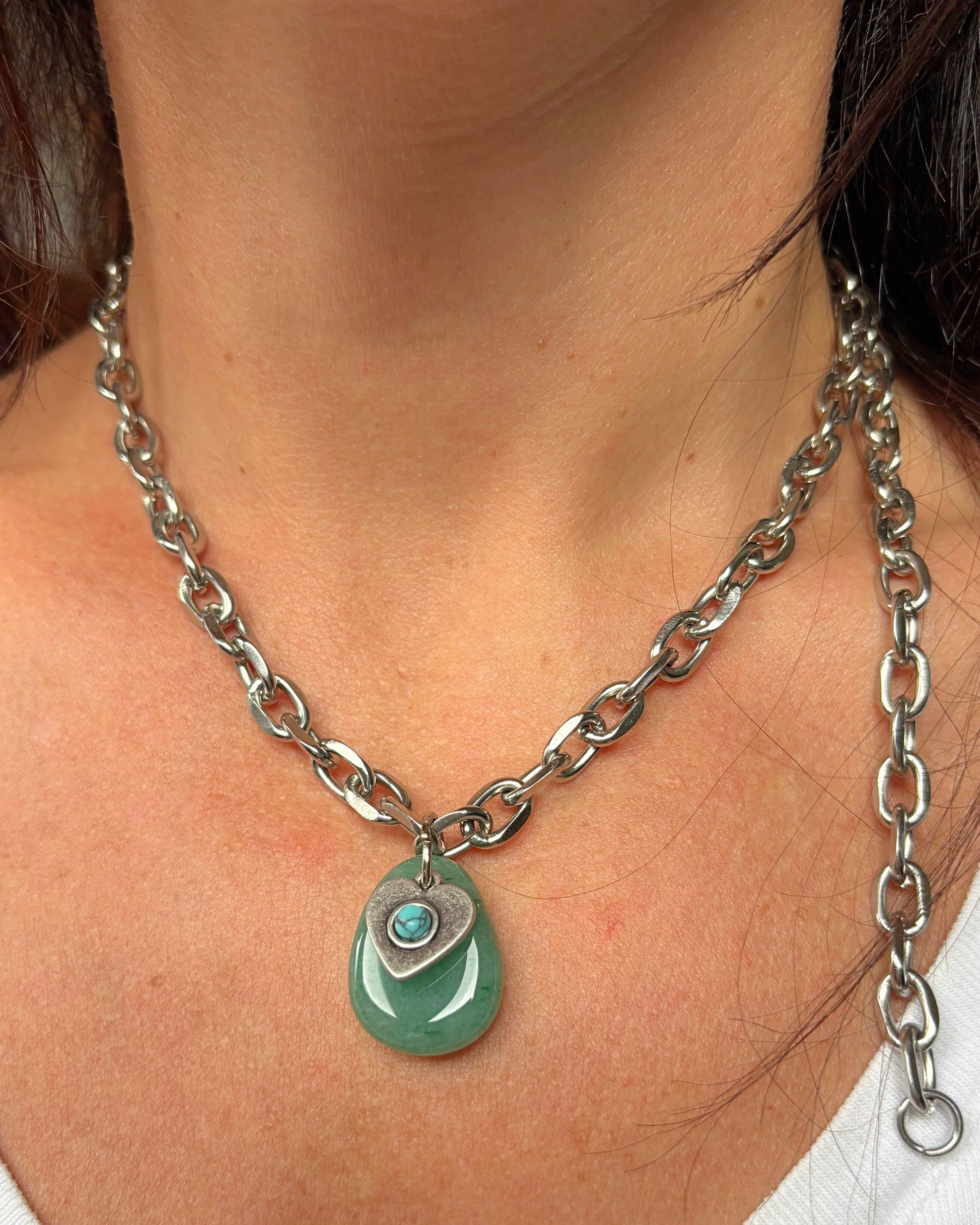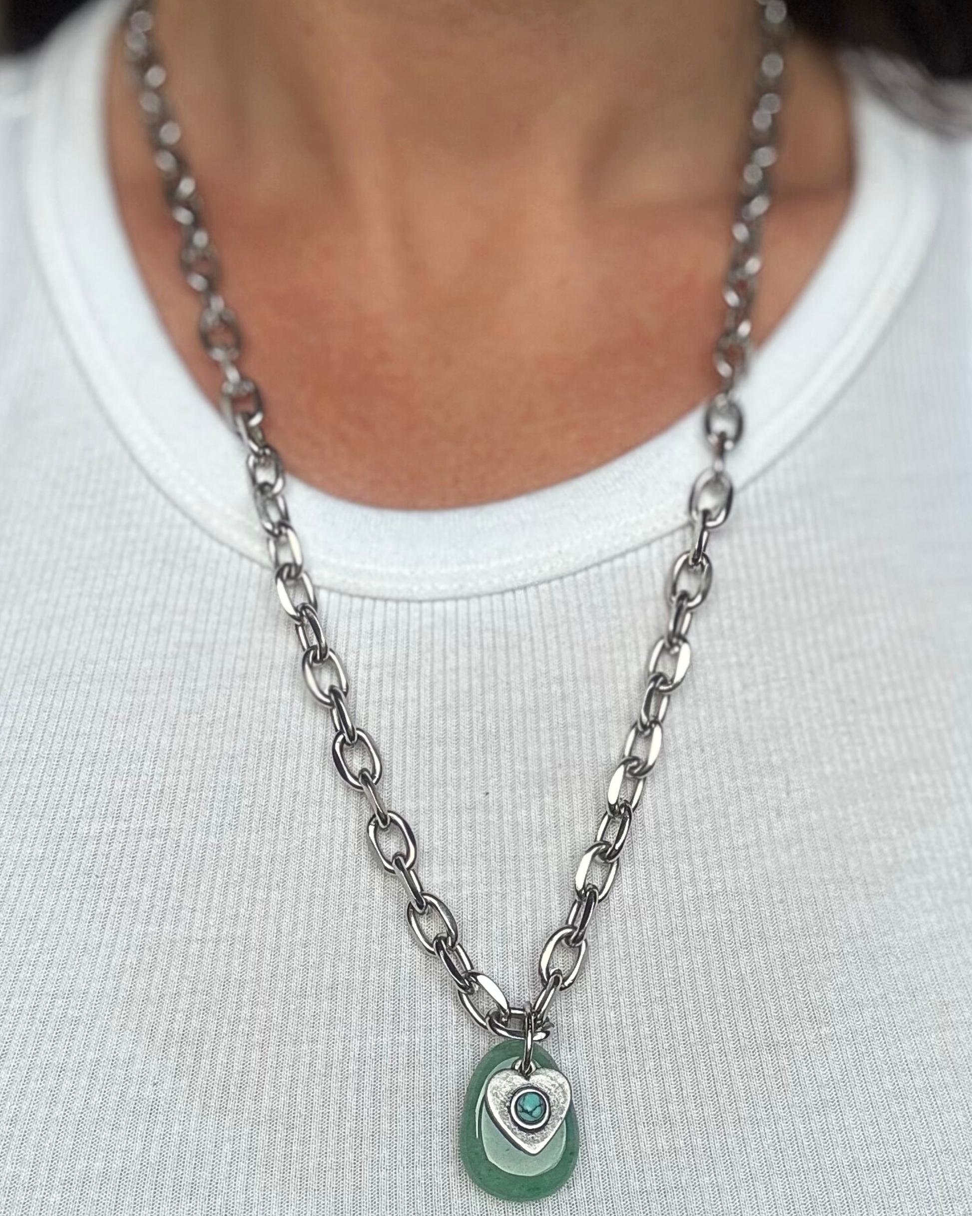 Collar de cadena gruesa de largo ajustable con dije de piedra natural de Aventurina verde y dije de acero en forma de corazón con centro turquesa. Asociada al chacra corazón, la aventurina es una piedra natural que promueve el amor propio y la armonía en las relaciones, estimula la creatividad y la motivación, favorece la toma de decisiones aportando claridad mental.