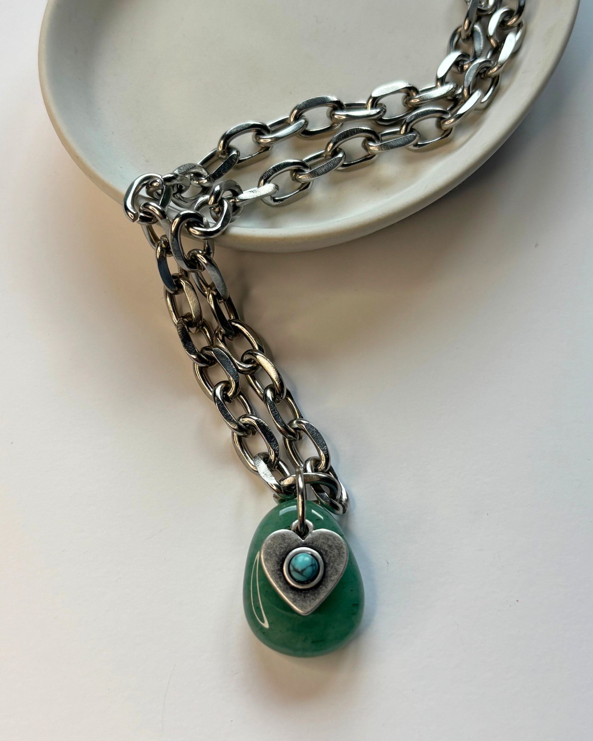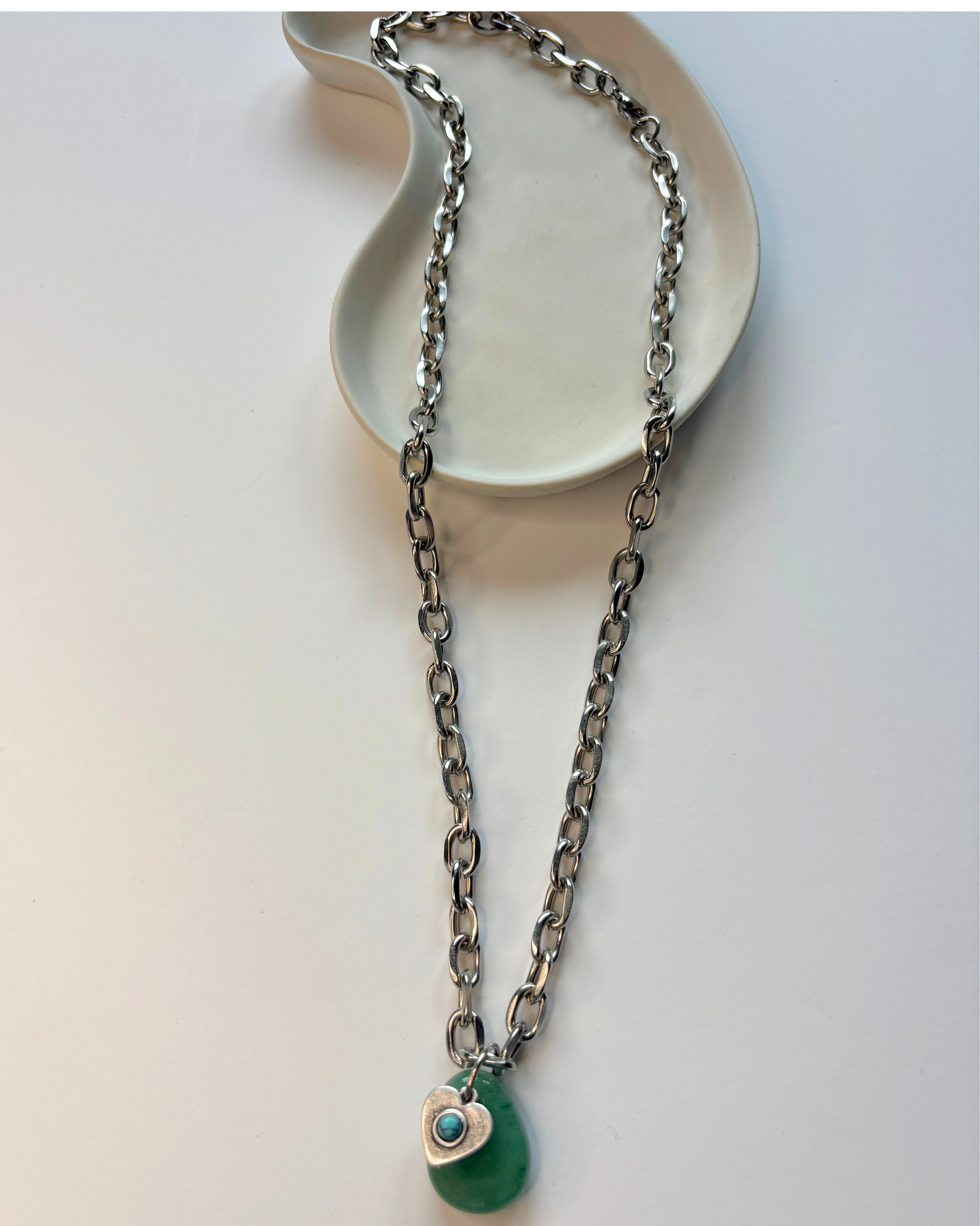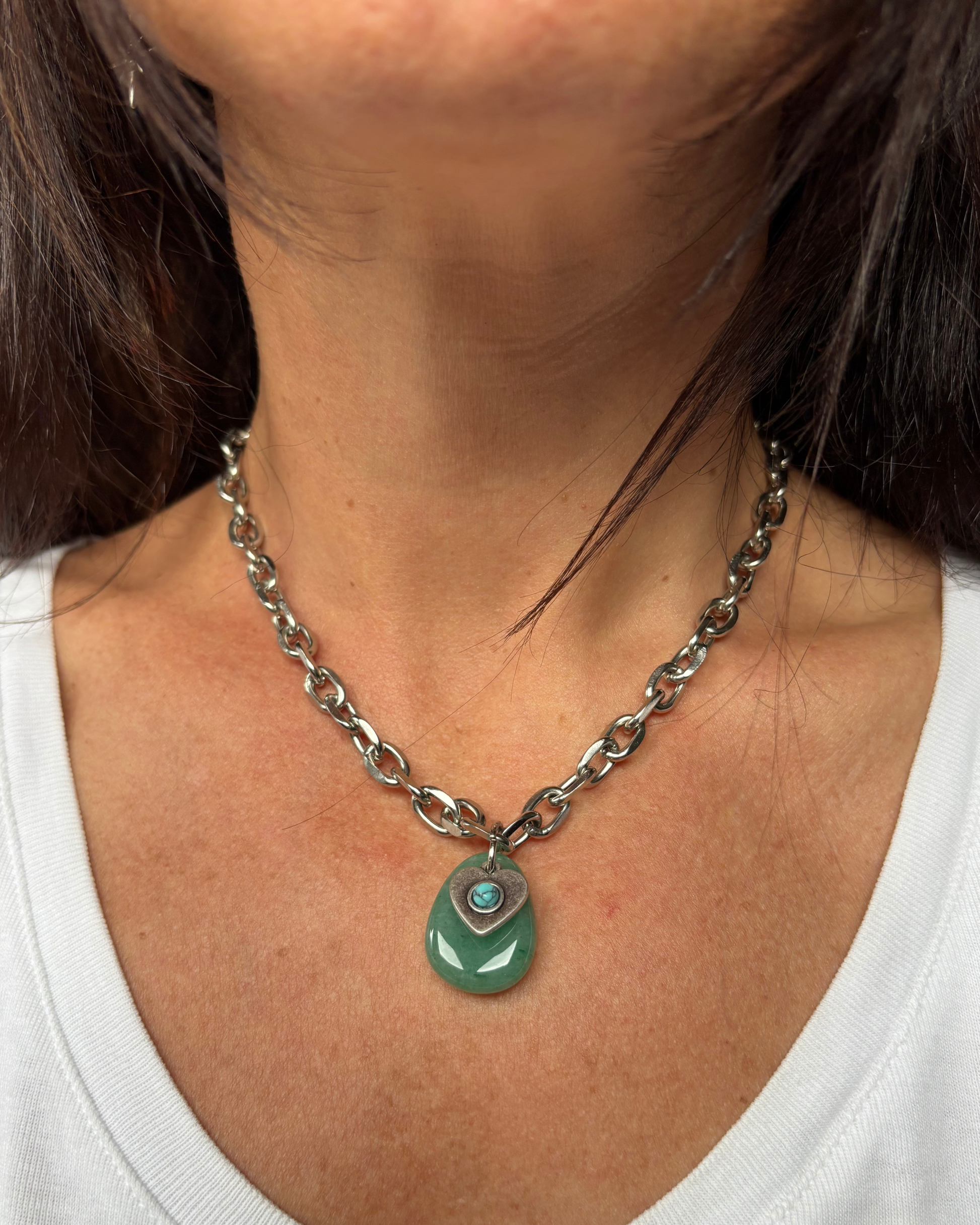 Collar de cadena gruesa de largo ajustable con dije de piedra natural de Aventurina verde y dije de acero en forma de corazón con centro turquesa. Asociada al chacra corazón, la aventurina es una piedra natural que promueve el amor propio y la armonía en las relaciones, estimula la creatividad y la motivación, favorece la toma de decisiones aportando claridad mental.