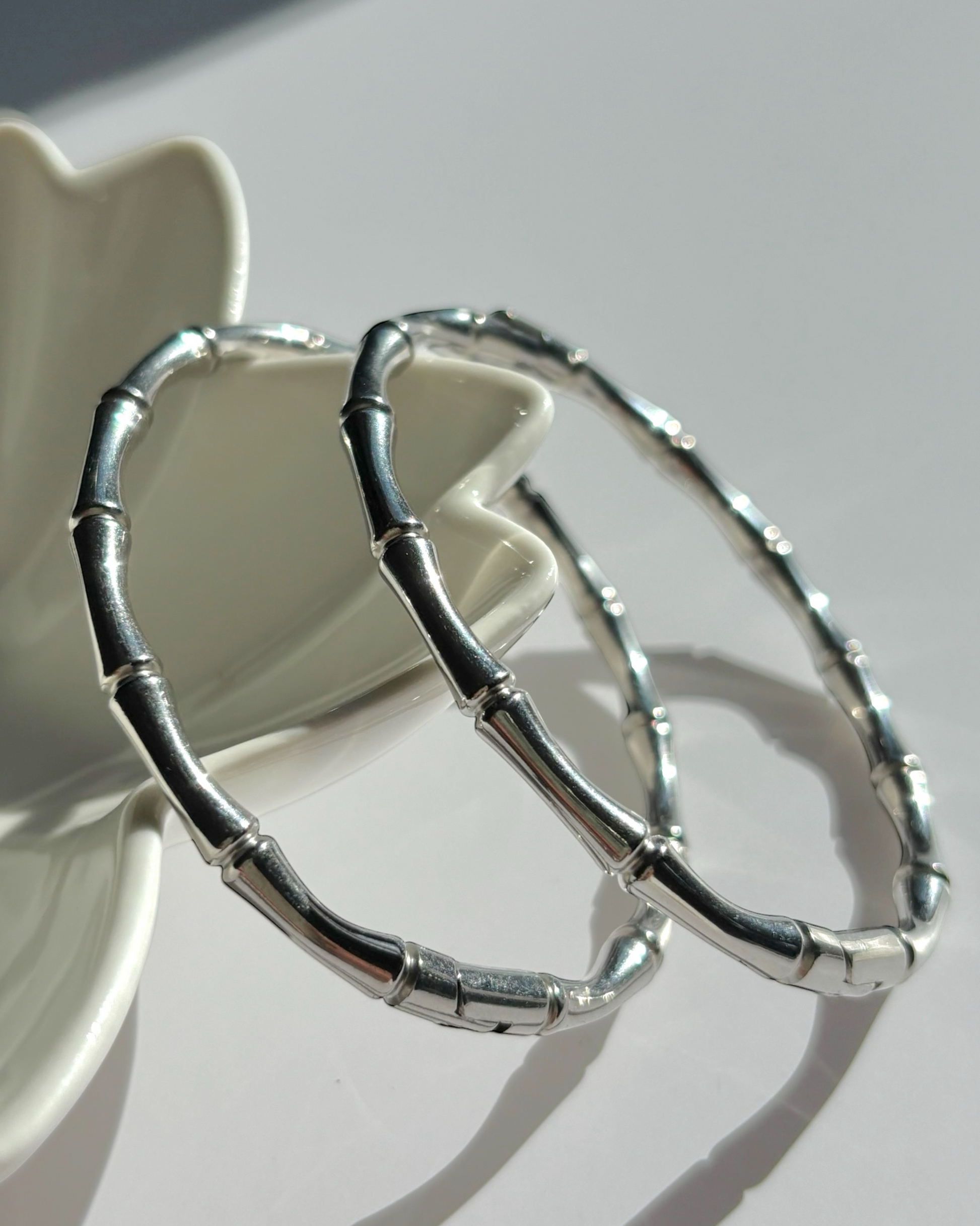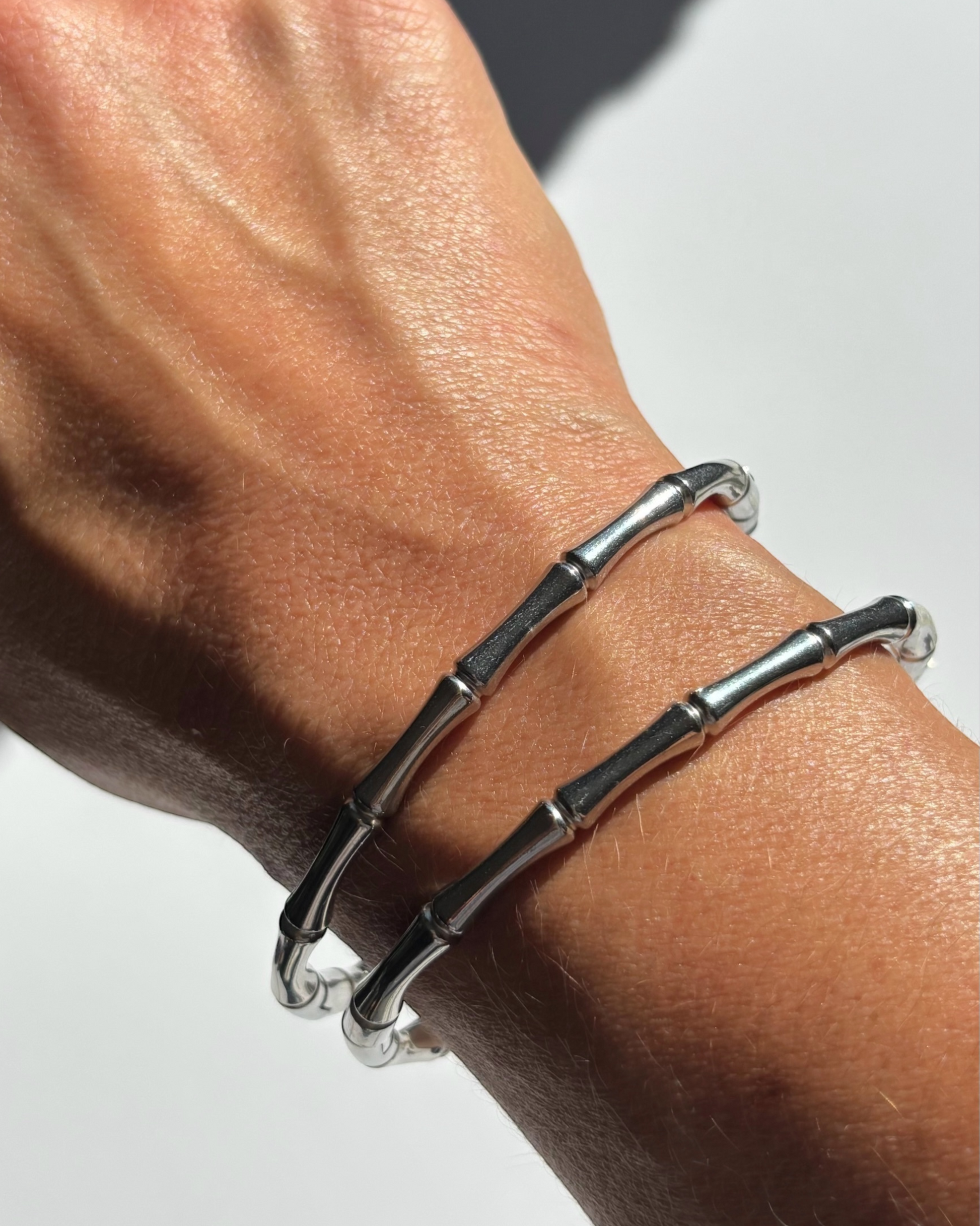 Esclava de acero inoxidable con textura estilo caña de bambú. Tiene una apertura lateral que la hace fácil de colocar en la muñeca. Simple, minimalista, perfecta para usar en solitario o acompañando otros accesorios.
