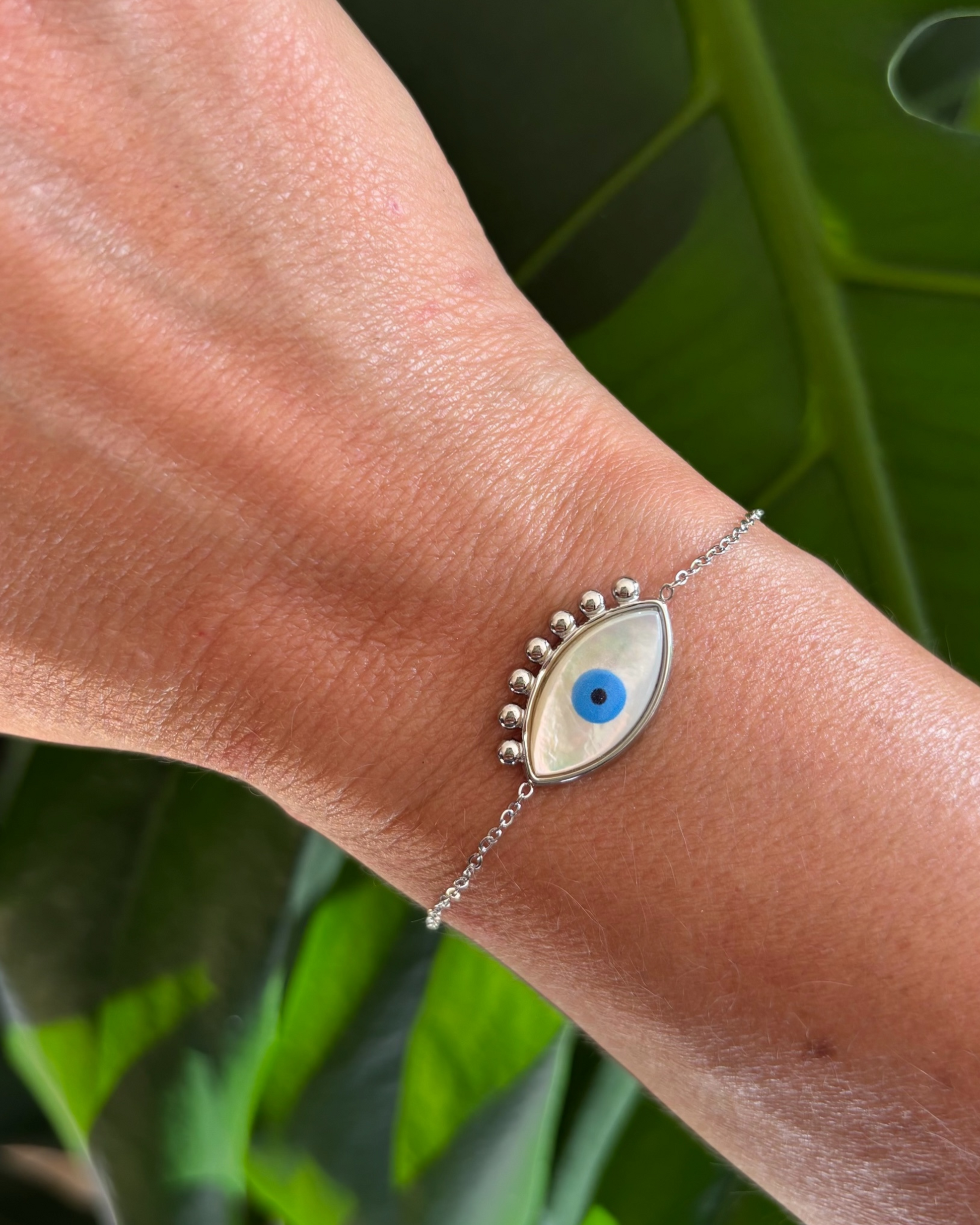 Pulsera de acero con Ojo Turco de nacar en el centro.