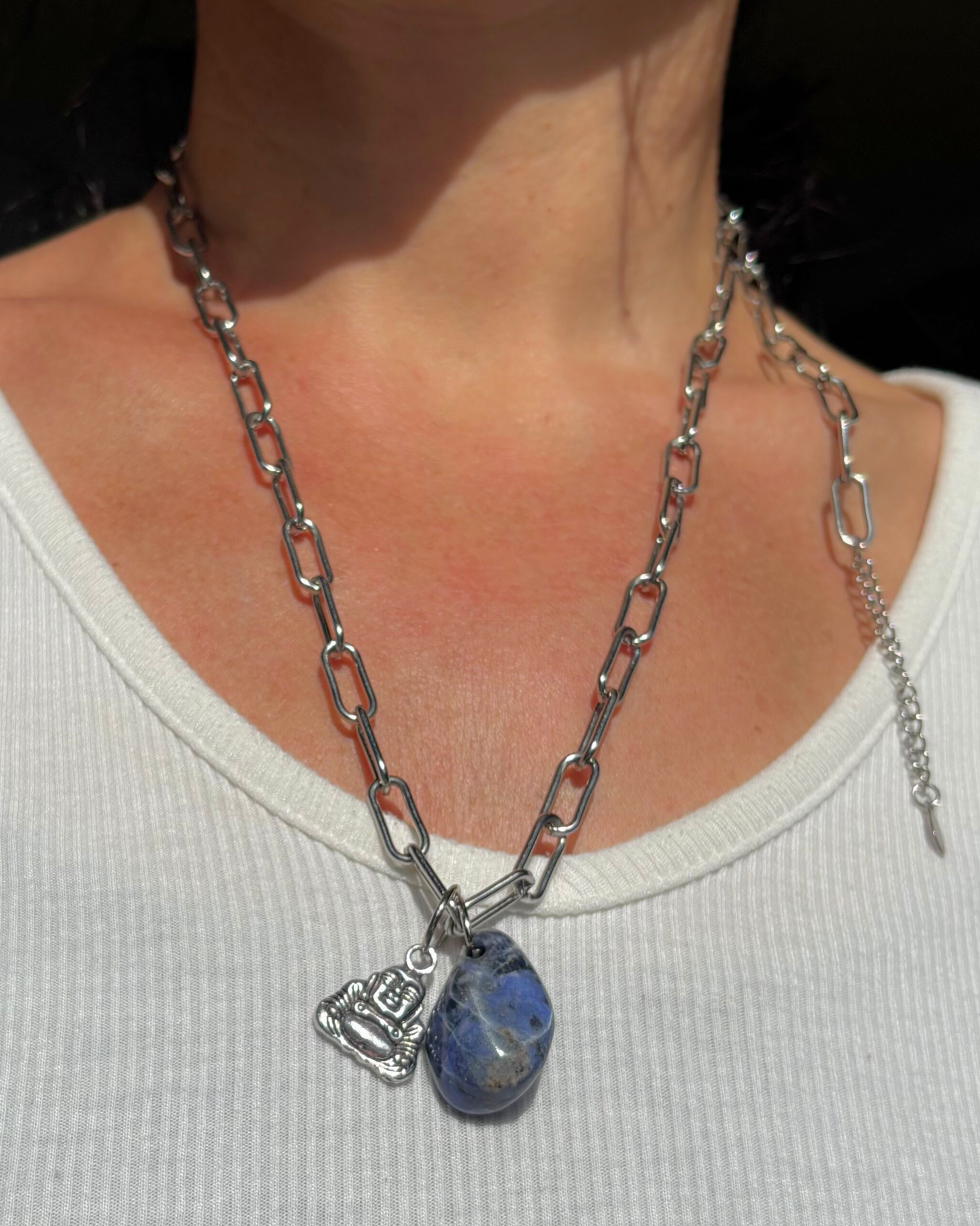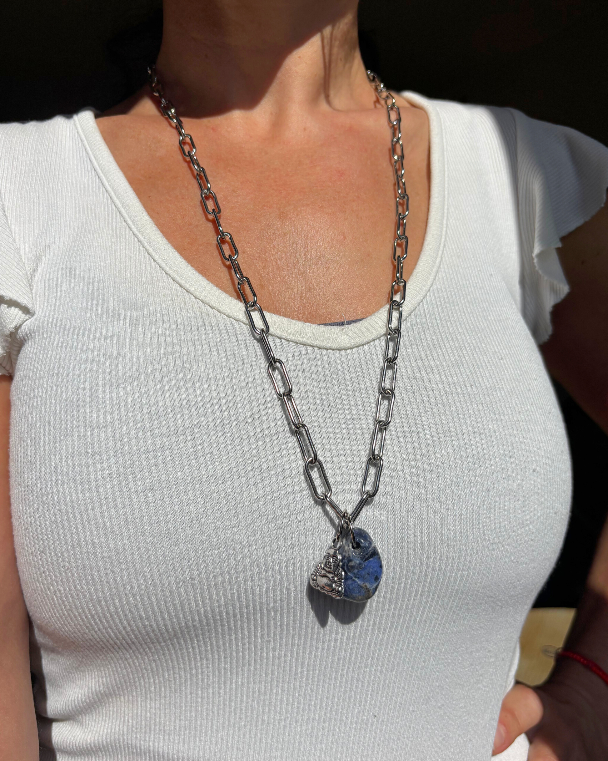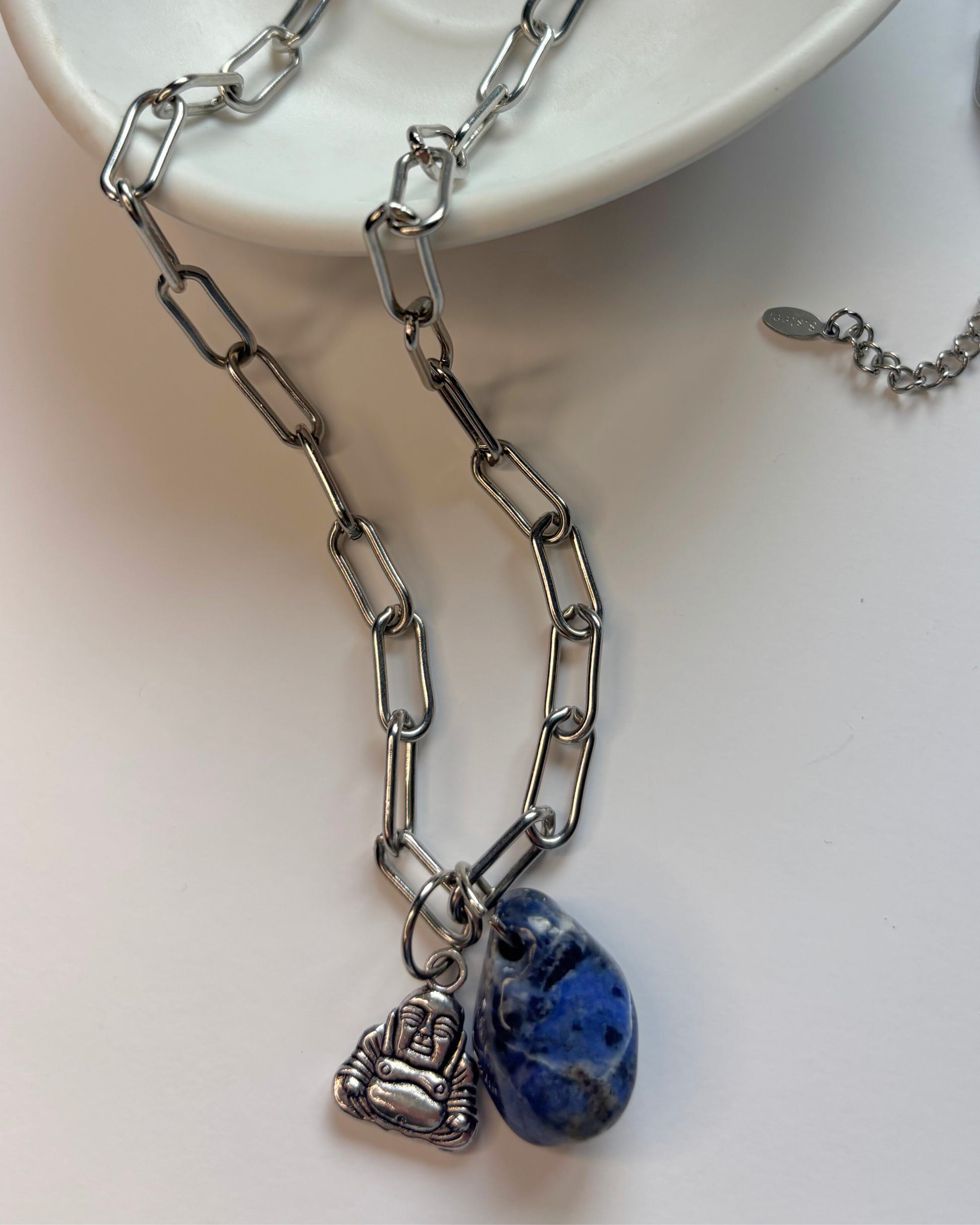 El collar combina un dije de piedra natural Lapislázuli conocido por promover claridad mental y sabiduría con un dije de Buda de acero, símbolo de paz interior, protección y equilibrio espiritual.