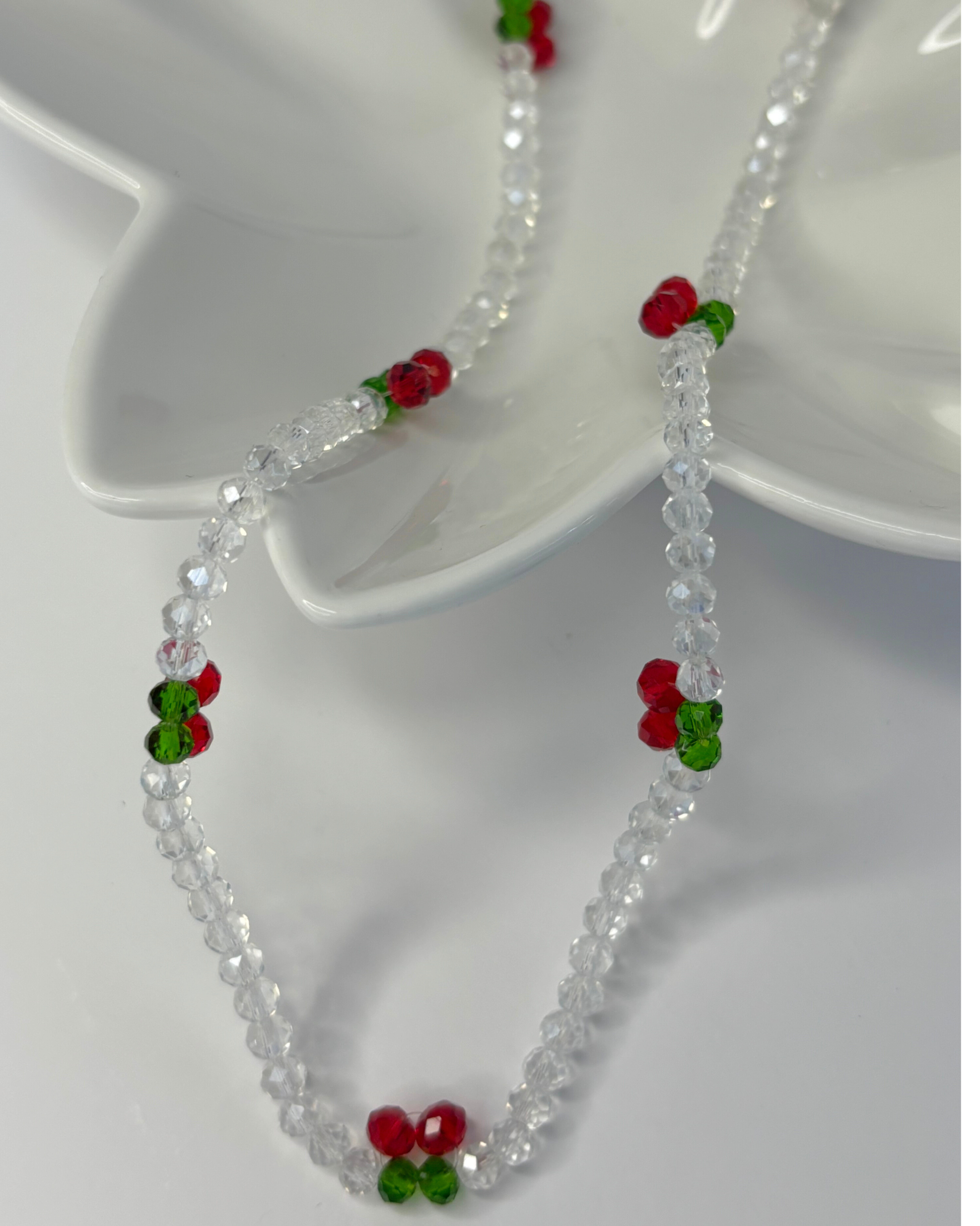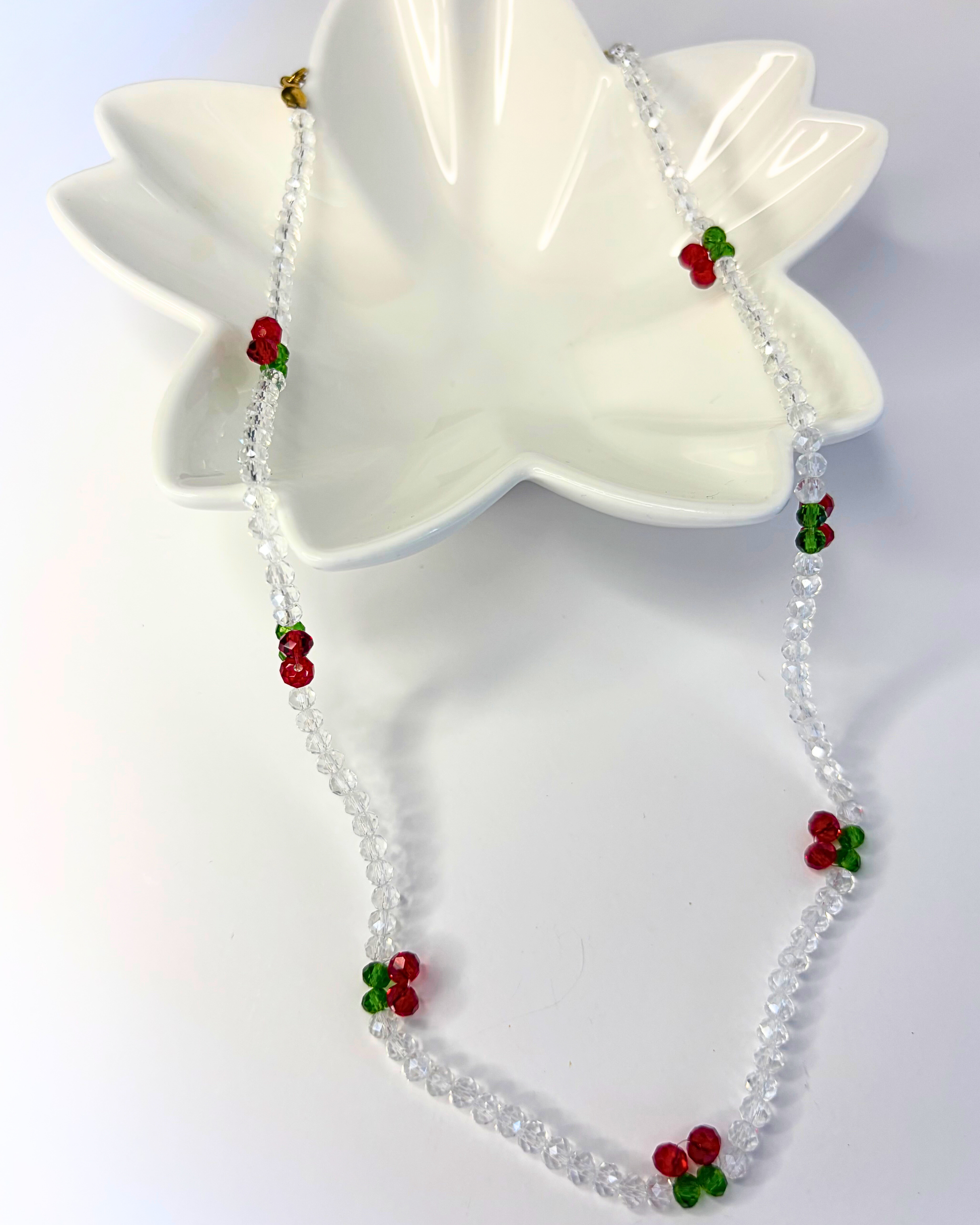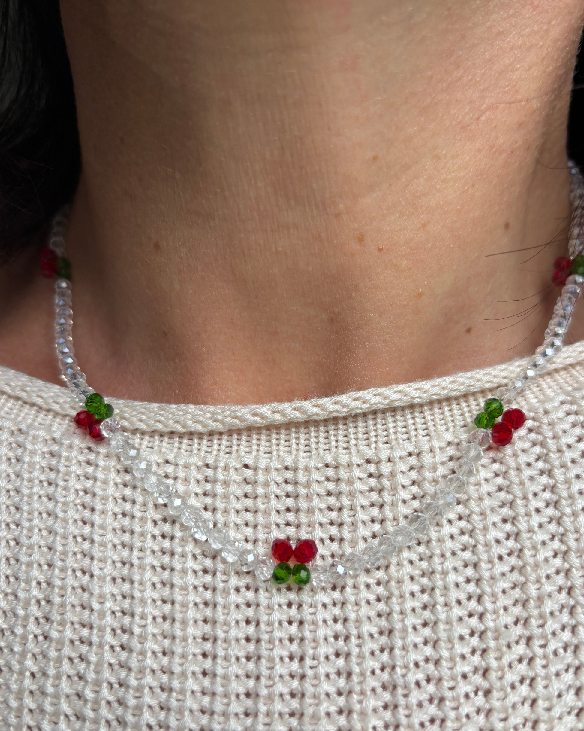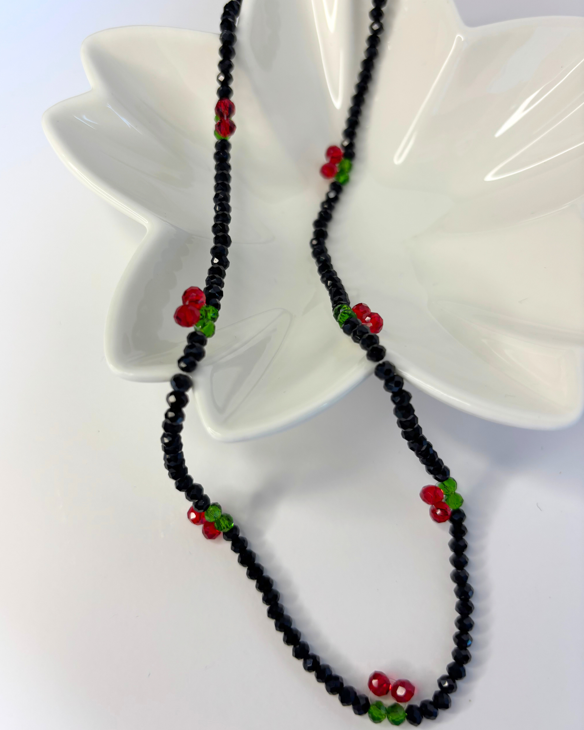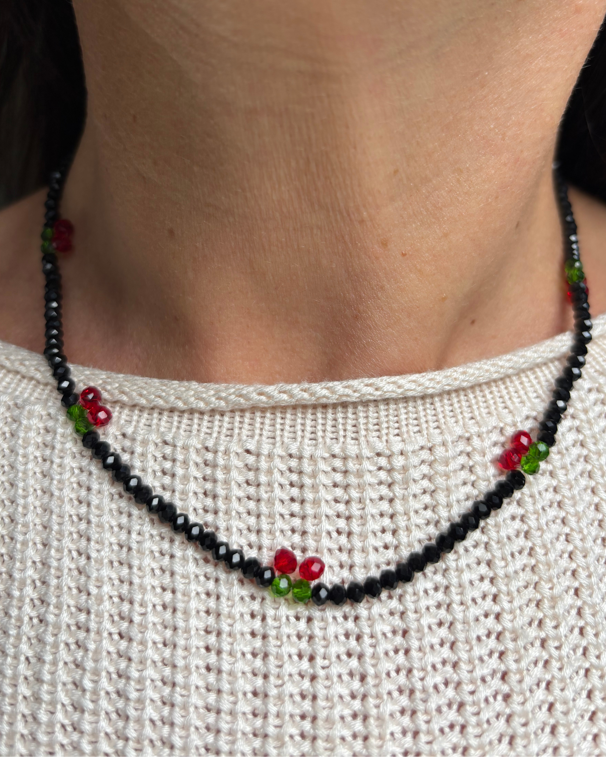 Collar de cristal facetado en color transparente 0 negro, ambos con detalle de cerezas.
