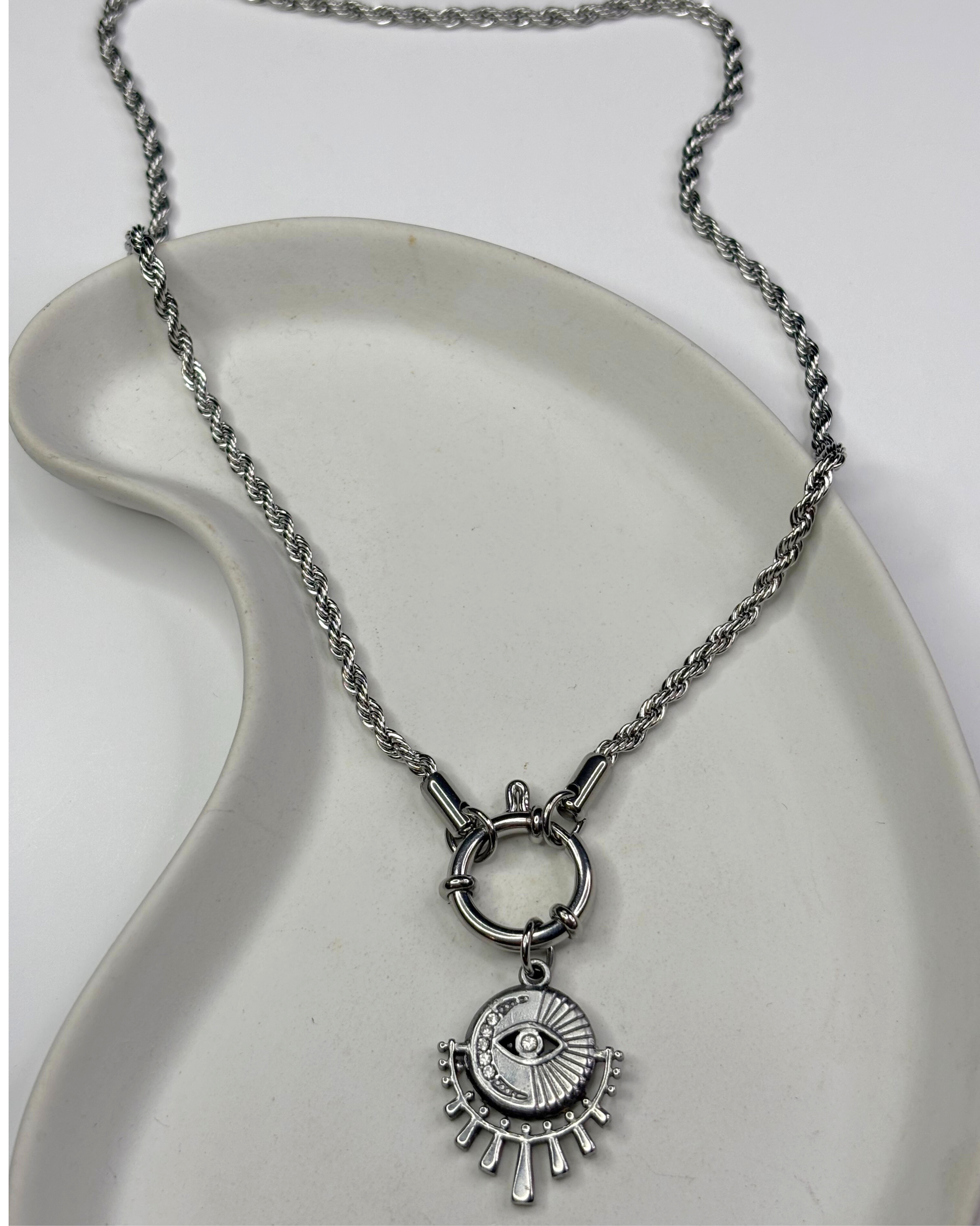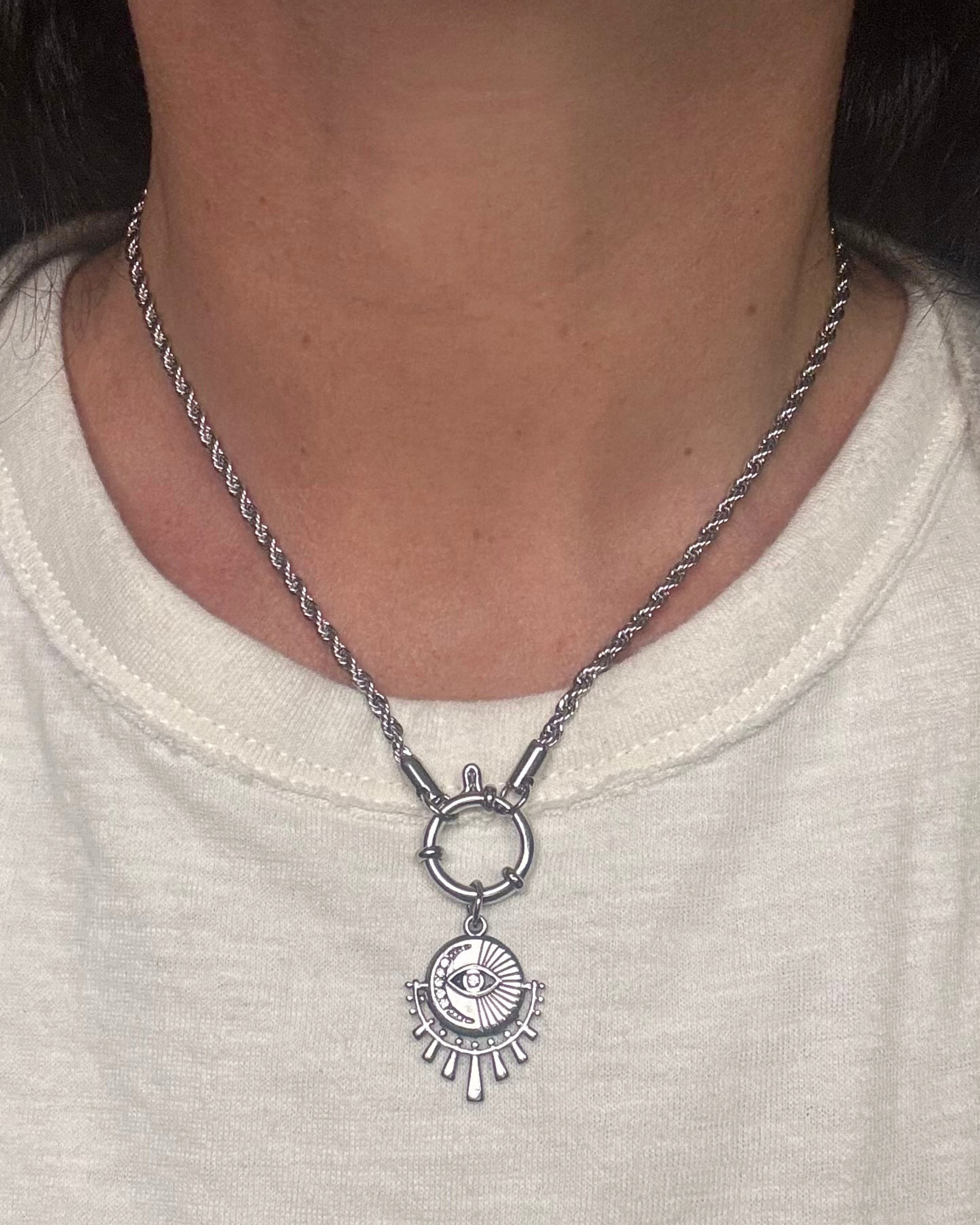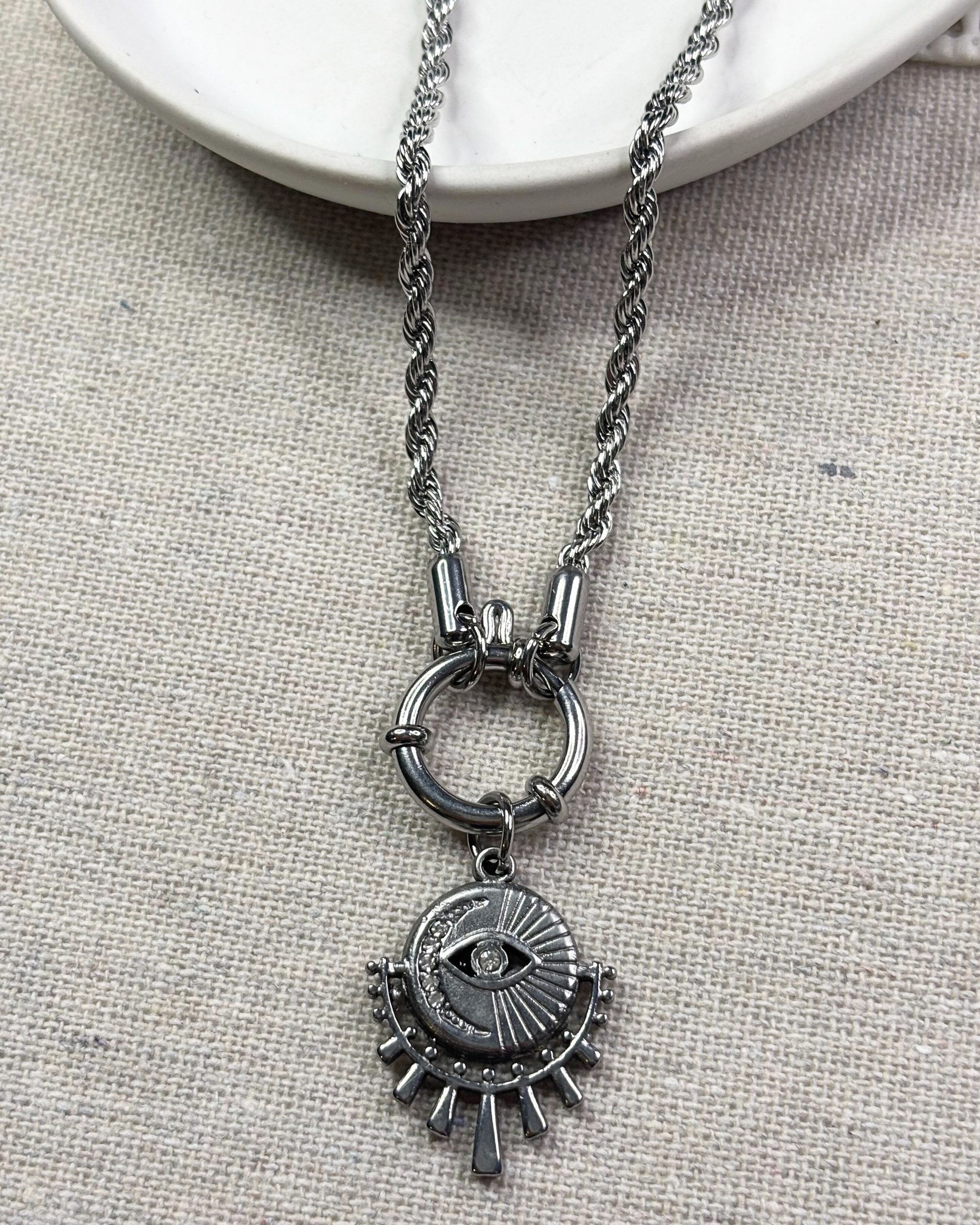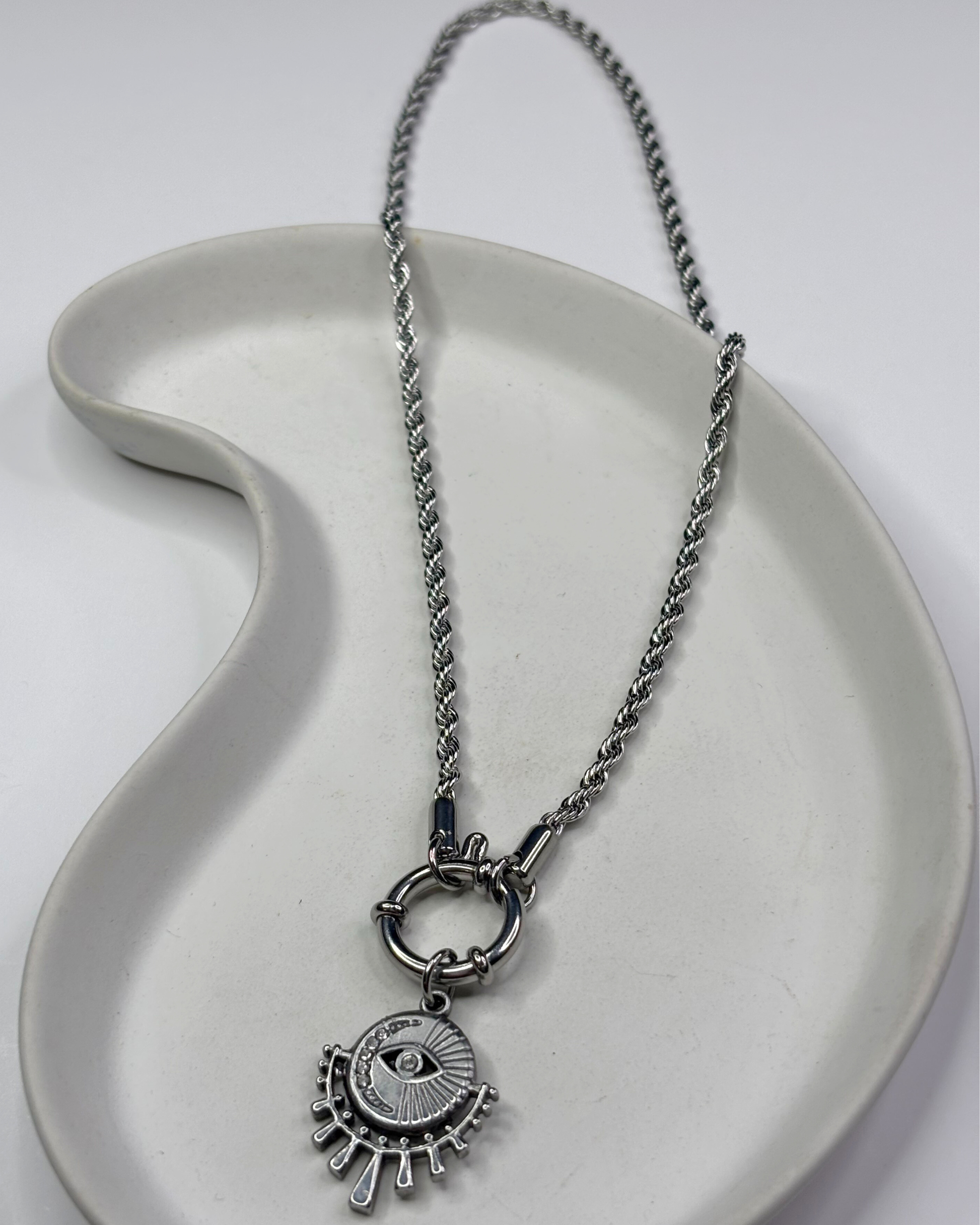 Cadena de acero trenzada con cierre de resorte de tamaño grande y dije de ojo turco y rayos