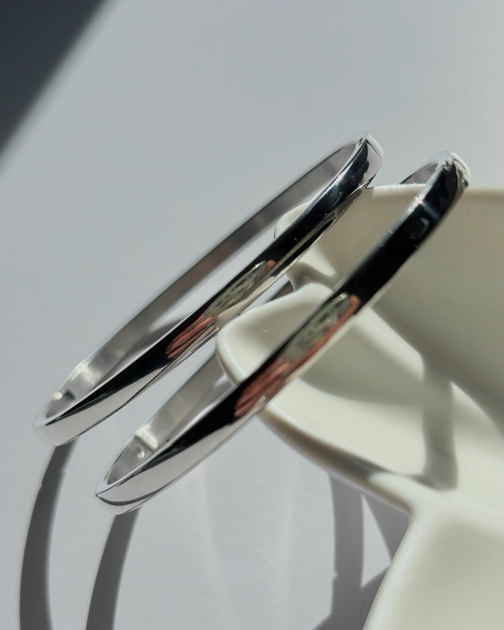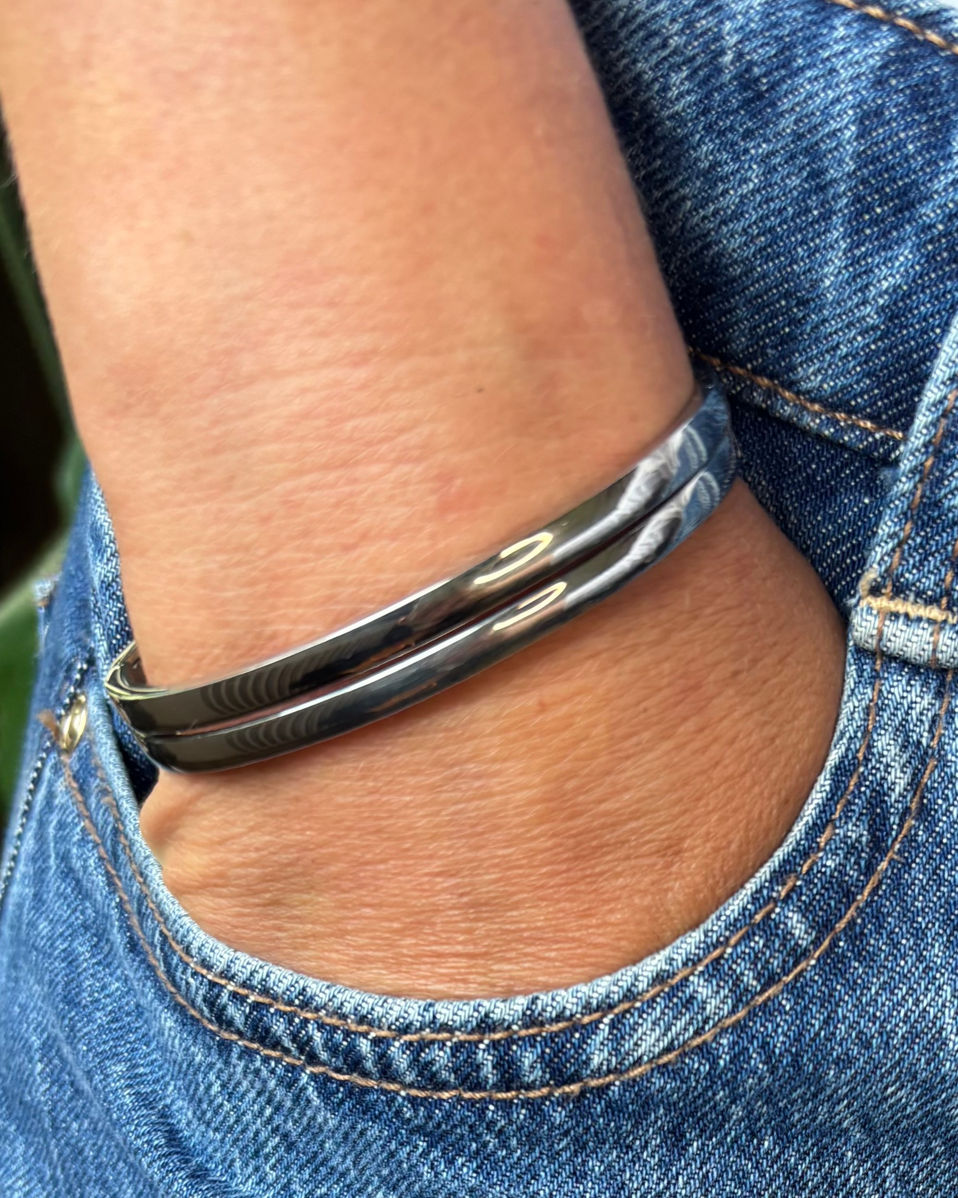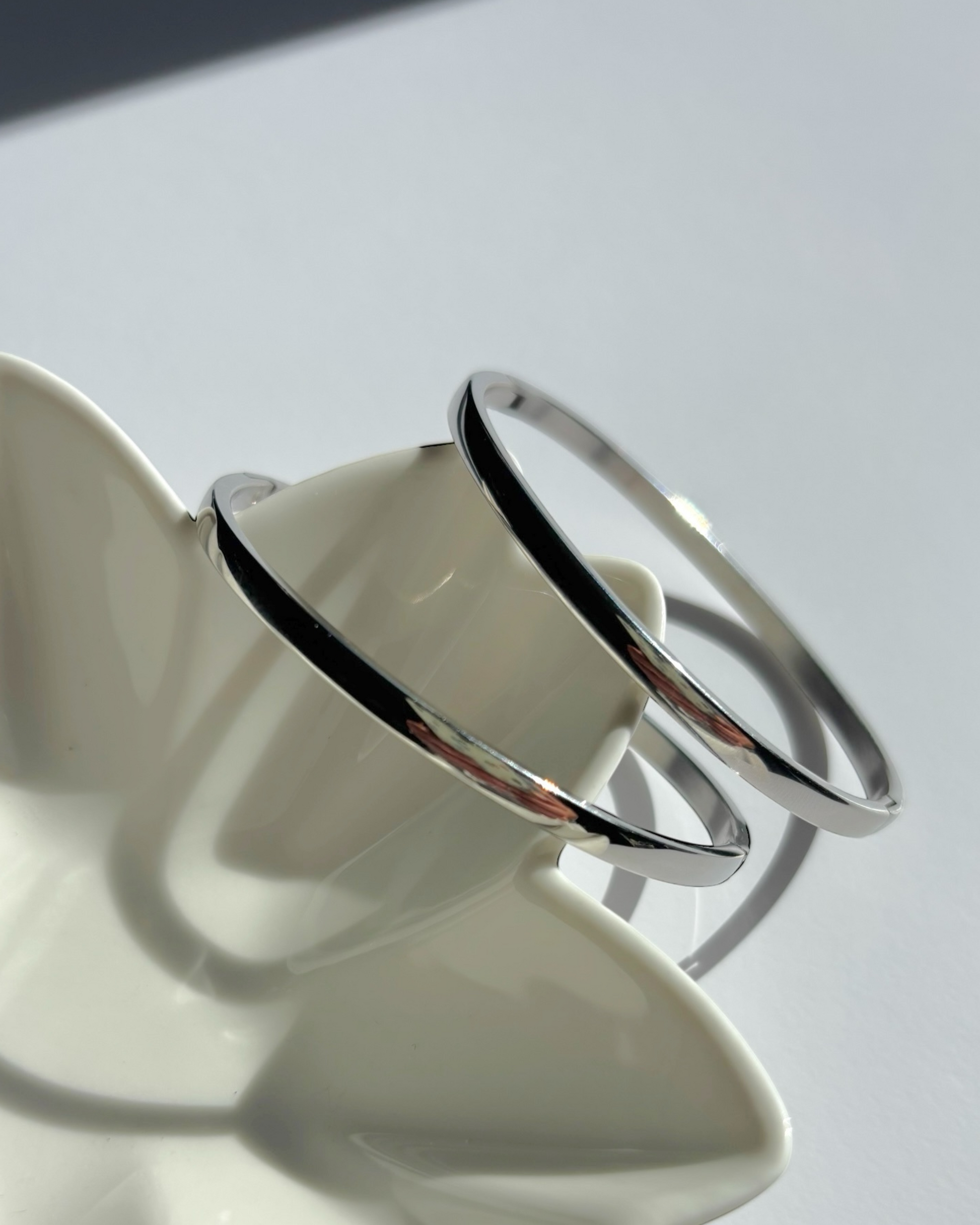Esclava de acero inoxidable de apertura lateral, lisa, simple, divina para usarla en compañía de otras pulseras del mismo estilo o de otro ya que es muy versatil. Un básico que siempre esta bueno tener entre tus accesorios.
