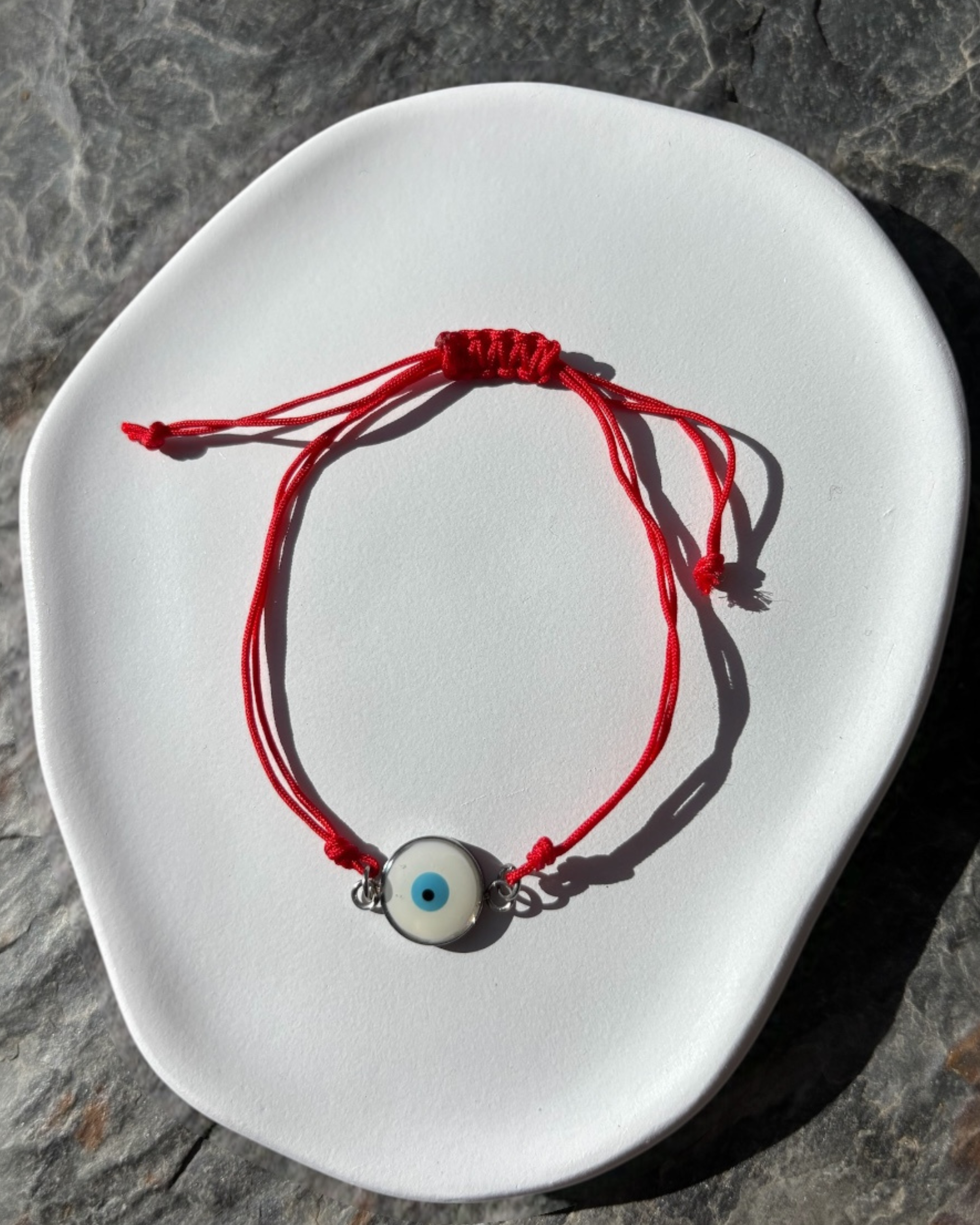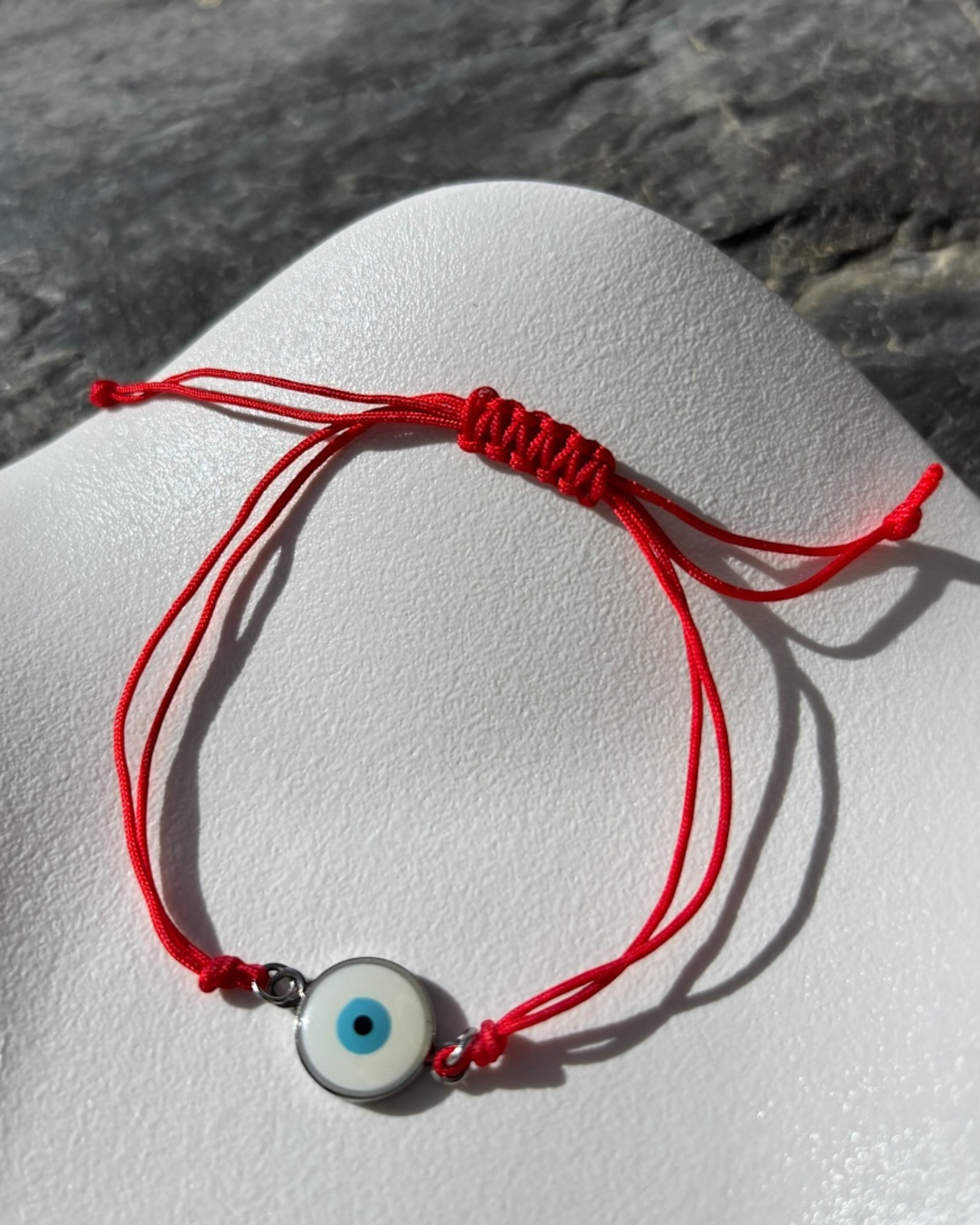 • Material: Hilo rojo de nylon trenzado y dije metálico con ojo turco de vidrio.
