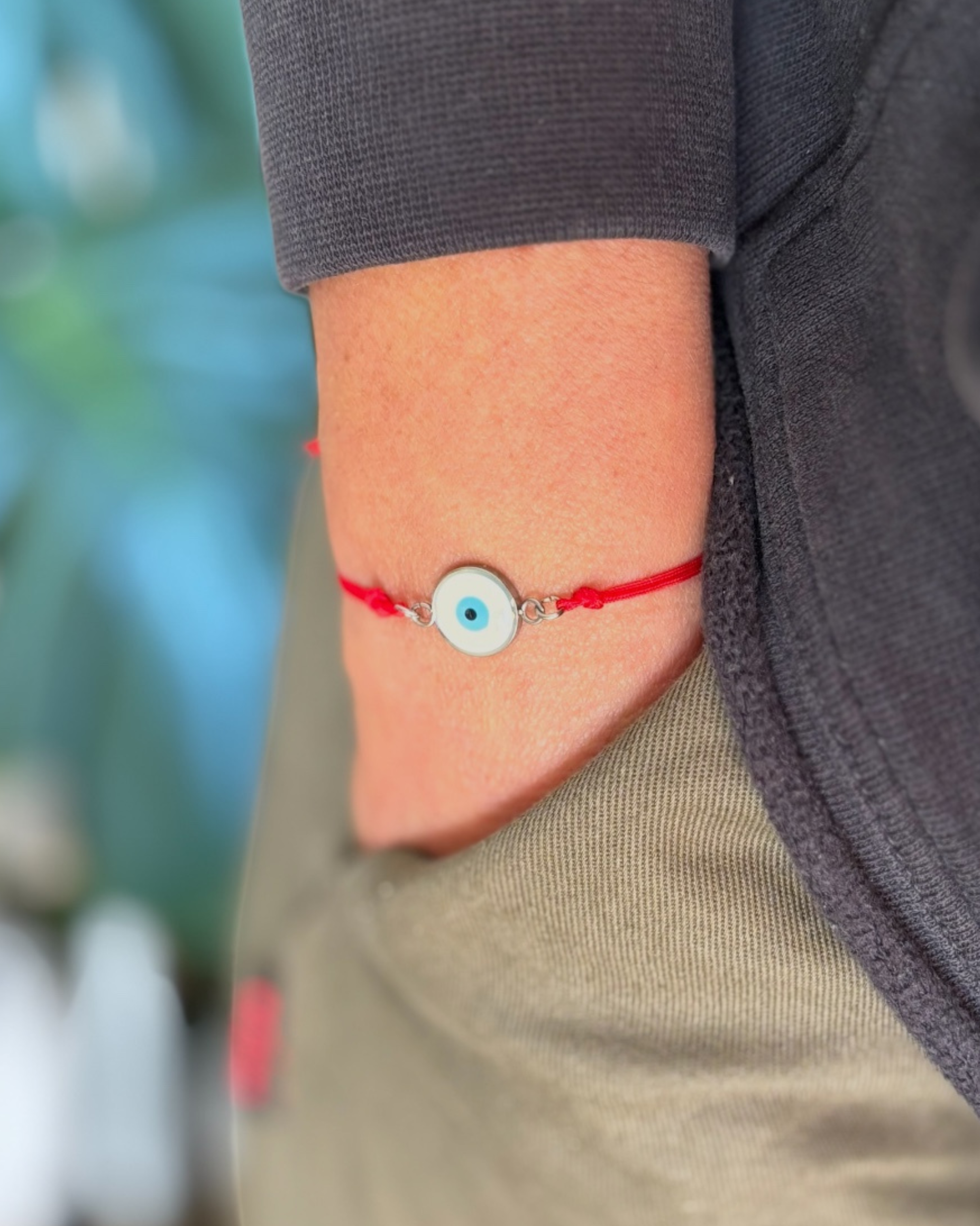 El cordón rojo simboliza fuerza, vitalidad y buena suerte, mientras que el ojo turco central actúa como escudo contra las energías negativas y el mal de ojo.