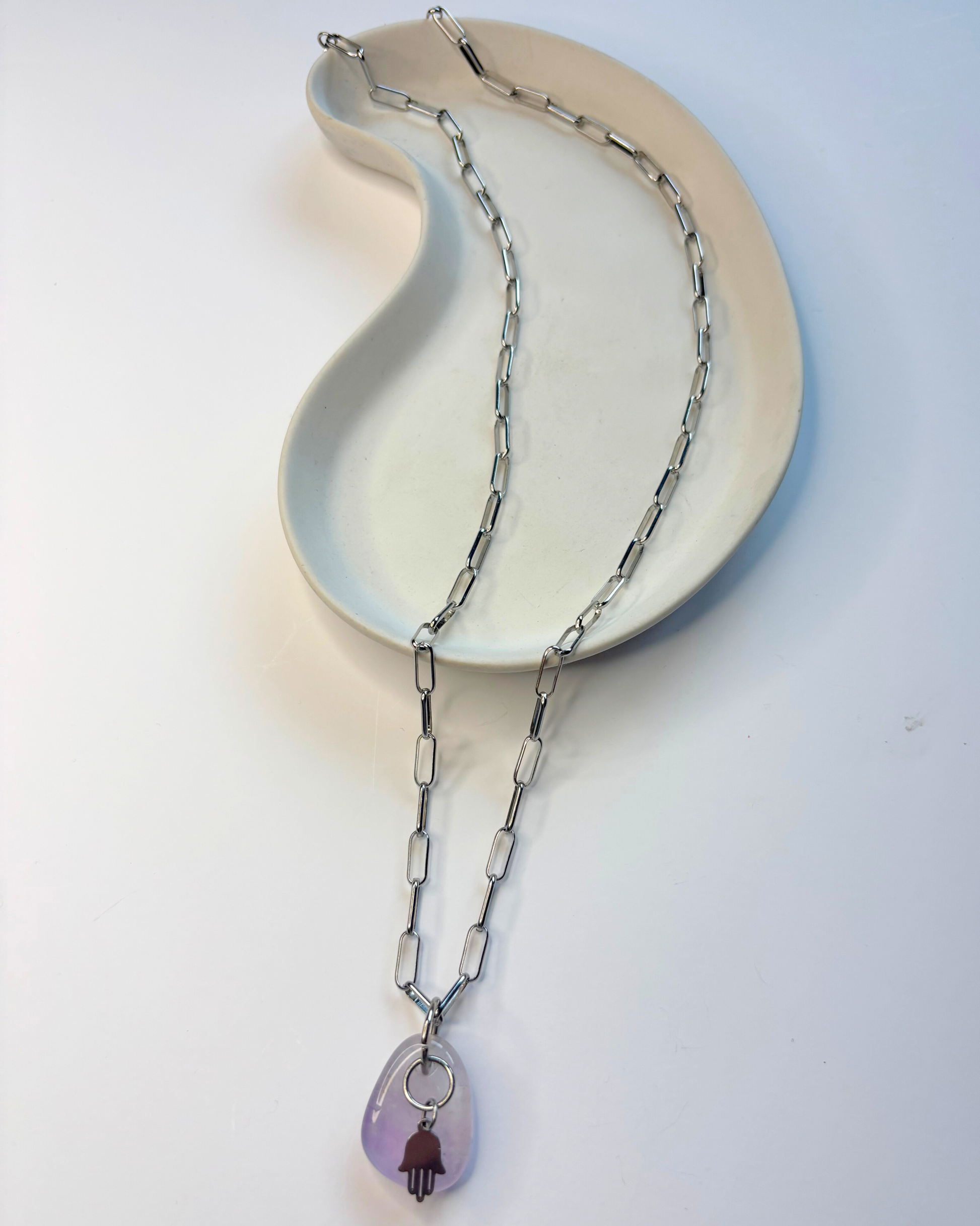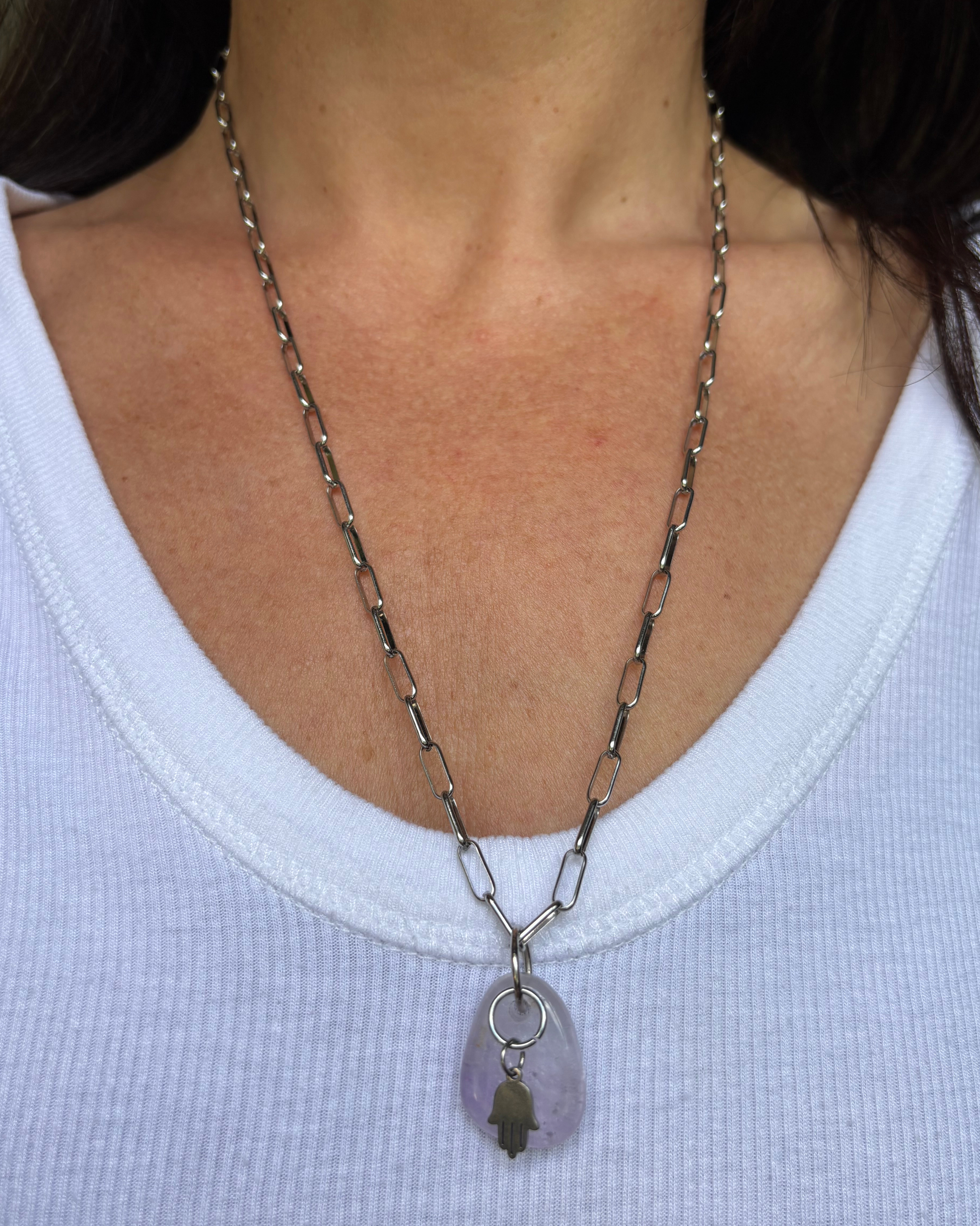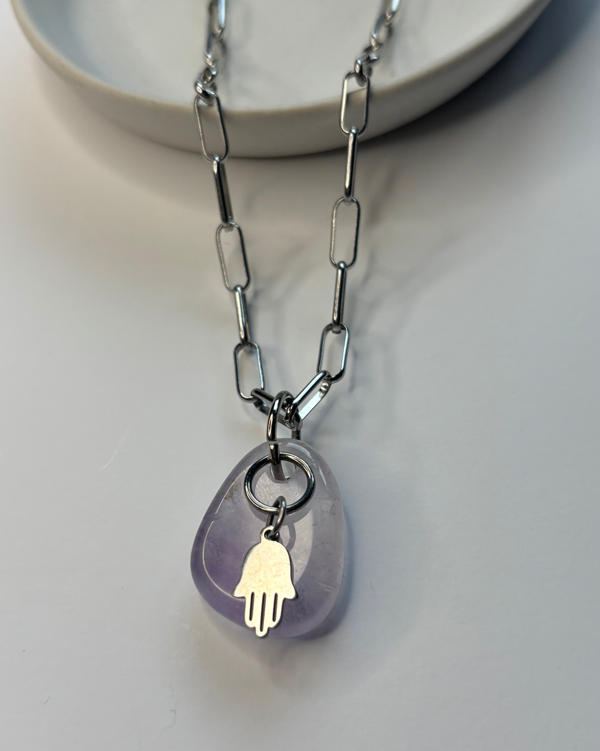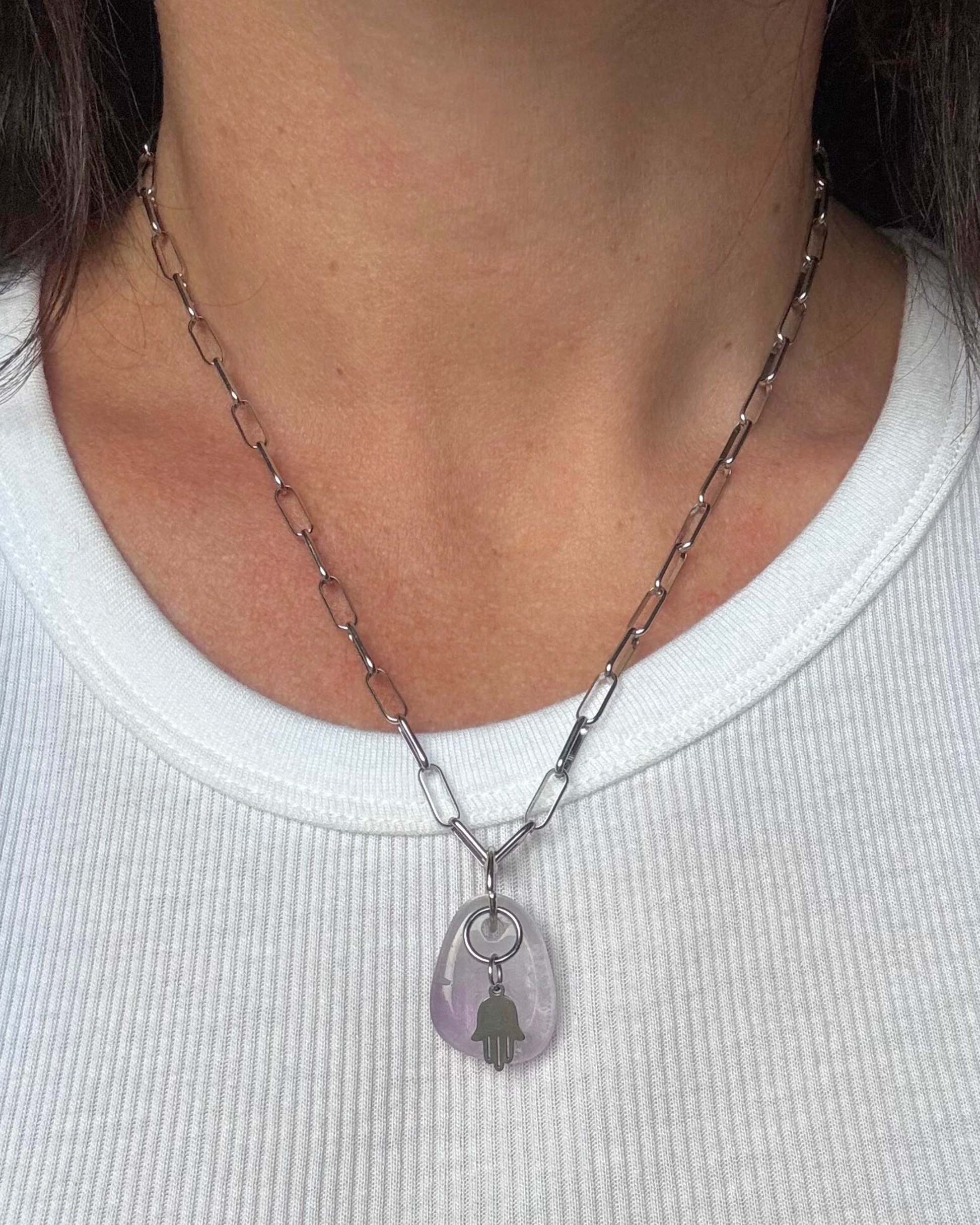 Un amuleto de calma y protección, este collar de acero inoxidable con cadena de largo ajustable combina la energía purificadora de la amatista fon el poder protector de la mano de Hamsa, símbolo universal contra las malas energías.