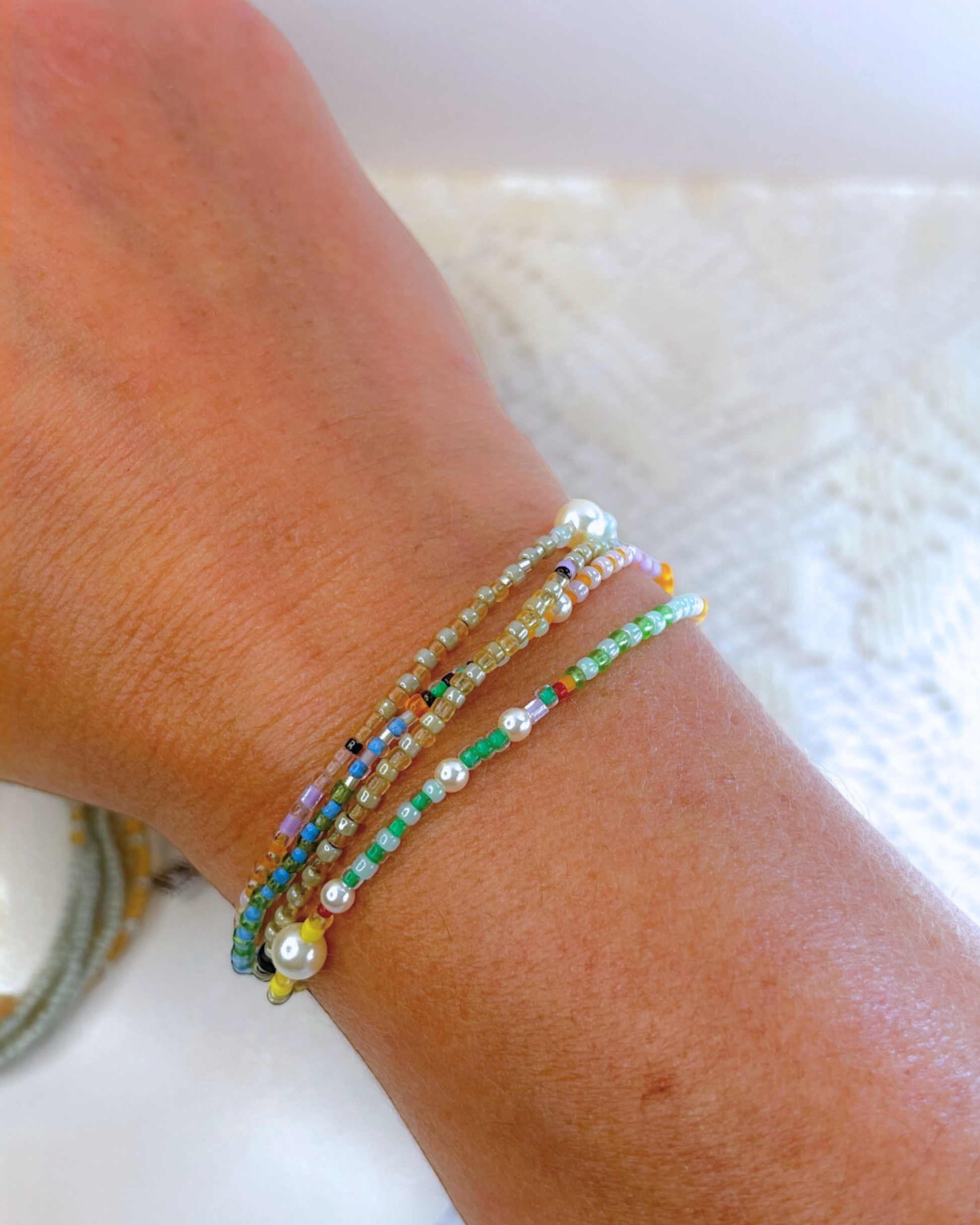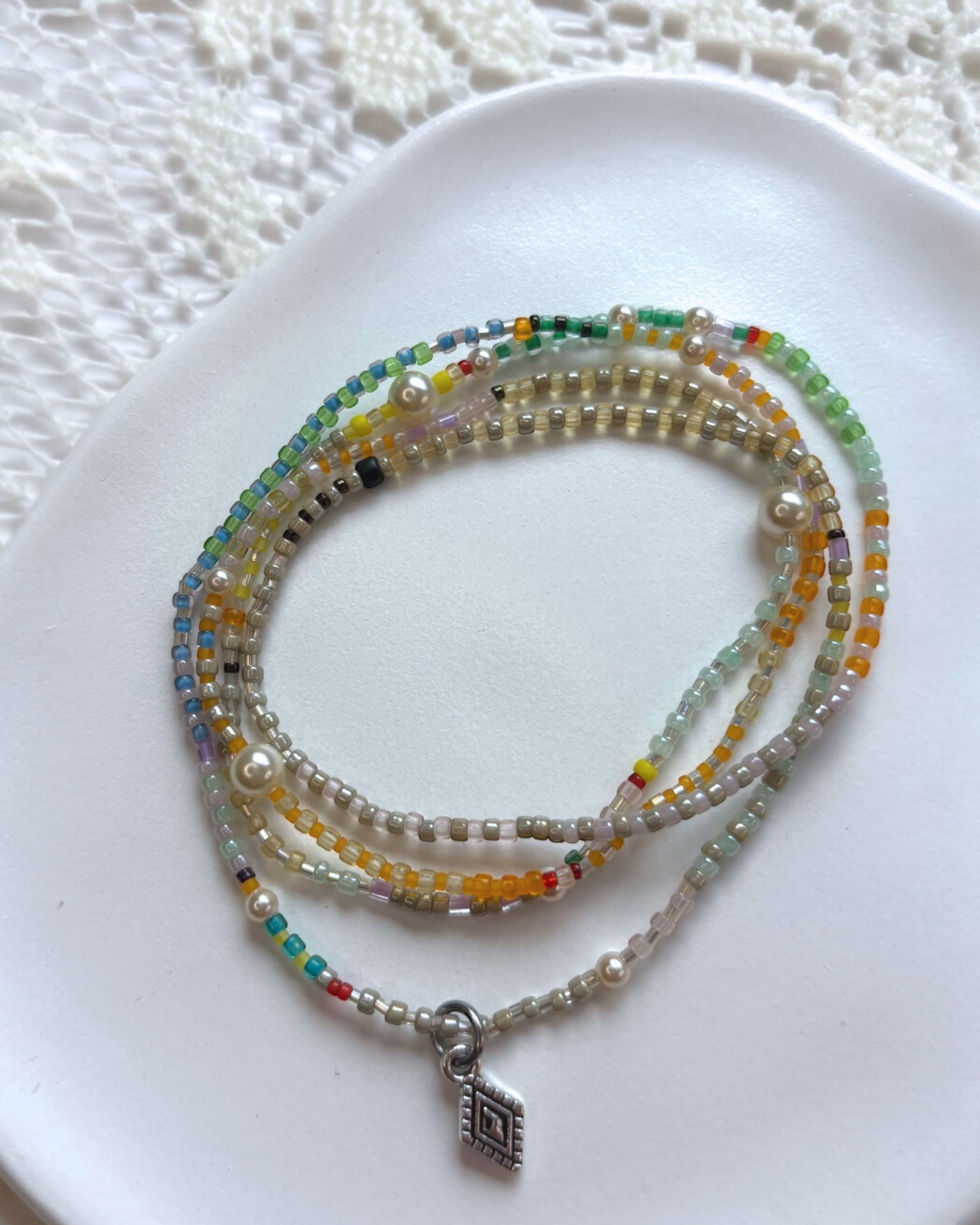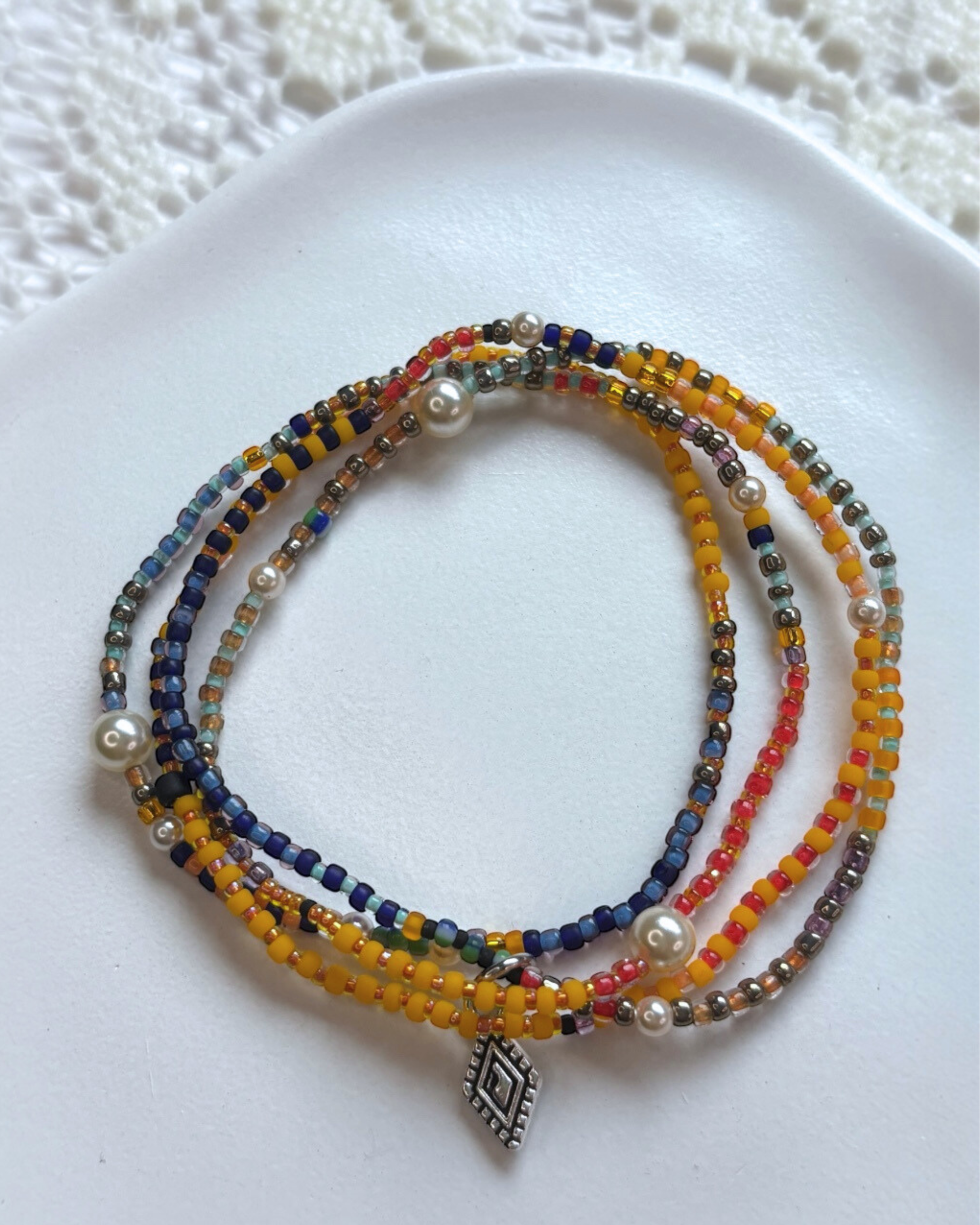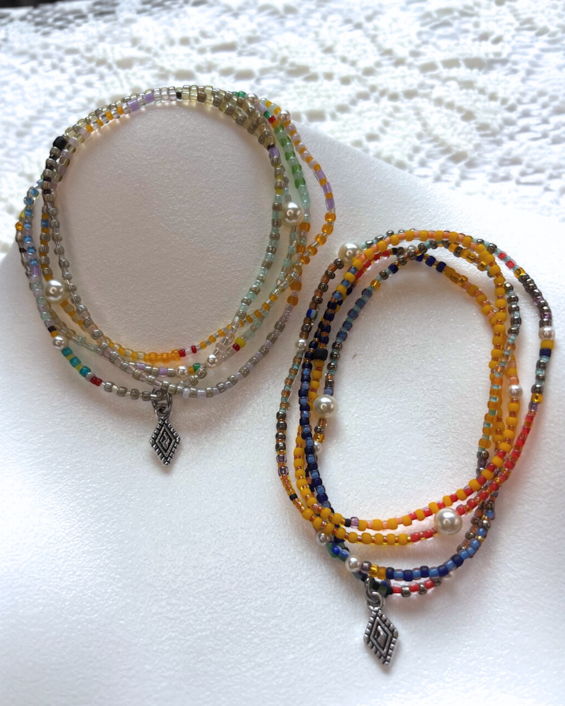 Descubrí la magia del color con nuestras pulseras artesanales hechas con mostacillas cuidadosamente seleccionadas. Cada pieza está confeccionada con tanza elástica resistente, lo que permite usarlas de tres formas distintas: como pulsera, collar o tobillera.