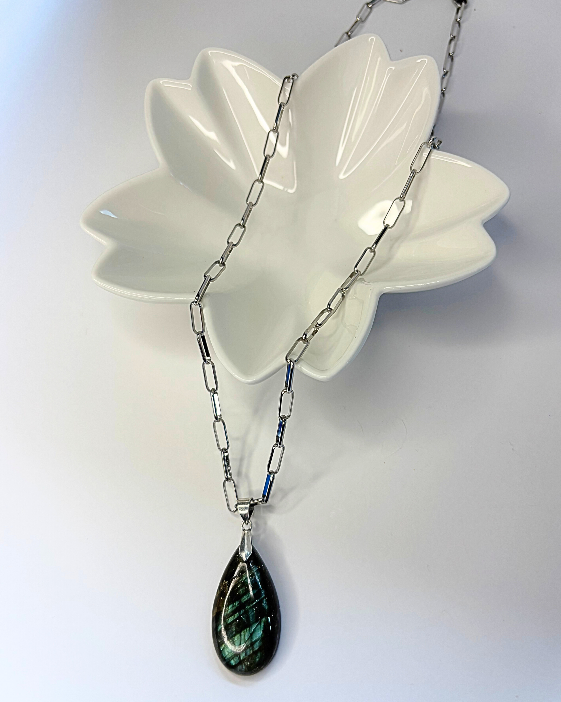 Collar de piedra natural de Labradorita con sus reflejos iridiscentes en tonos verdes azules y grises montada en una cadena de acero inoxidable de eslabon alargado y regulable al largo deseado.