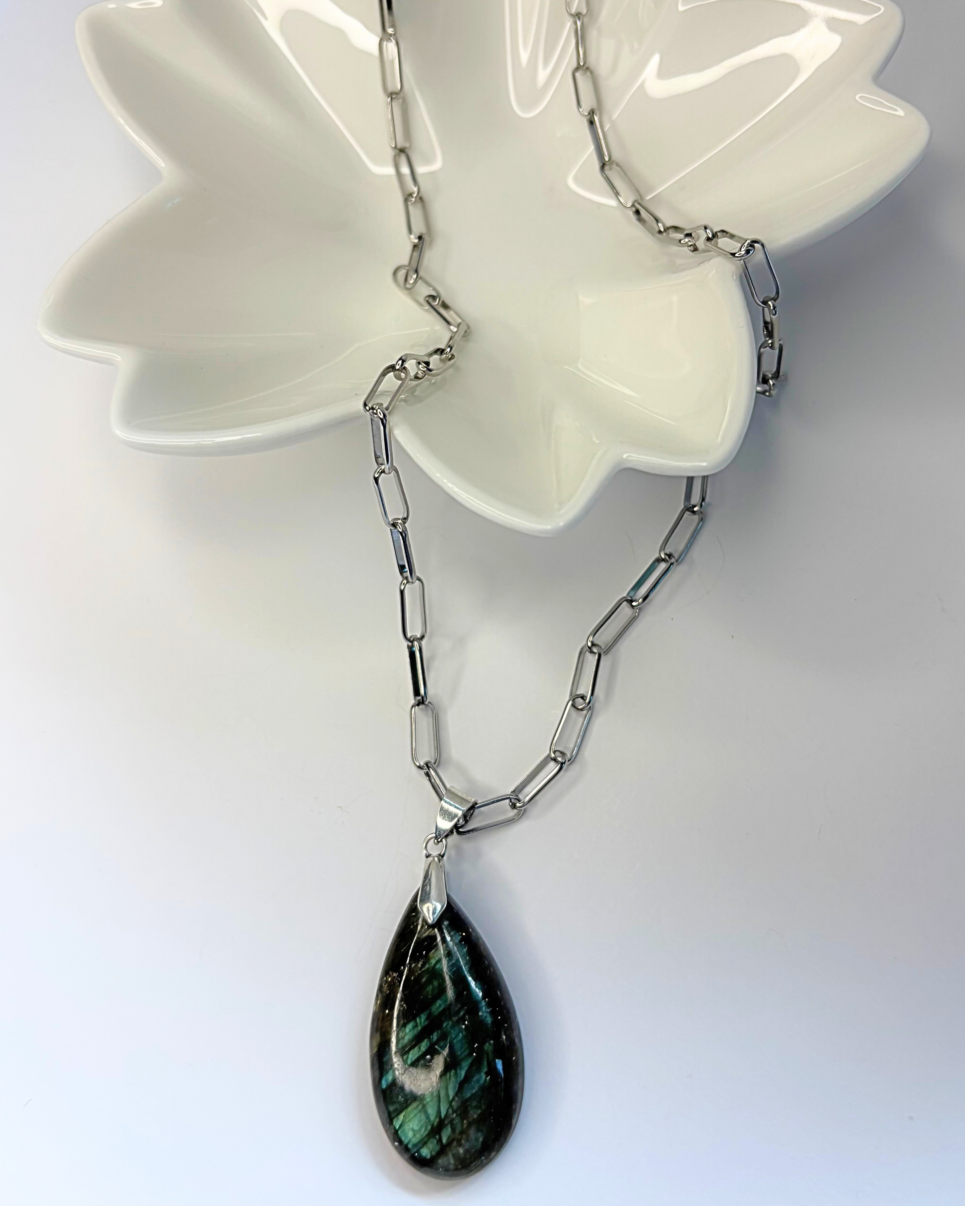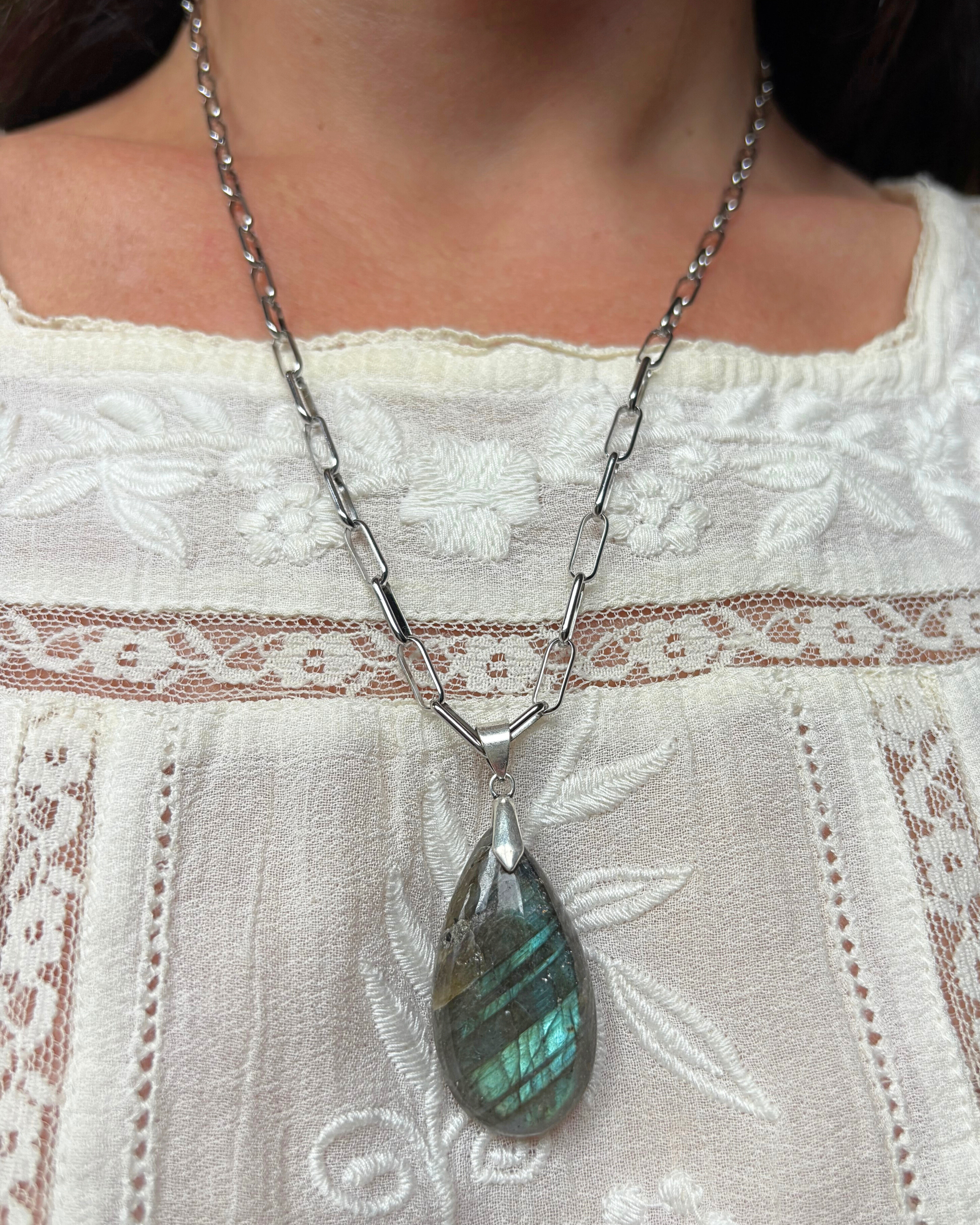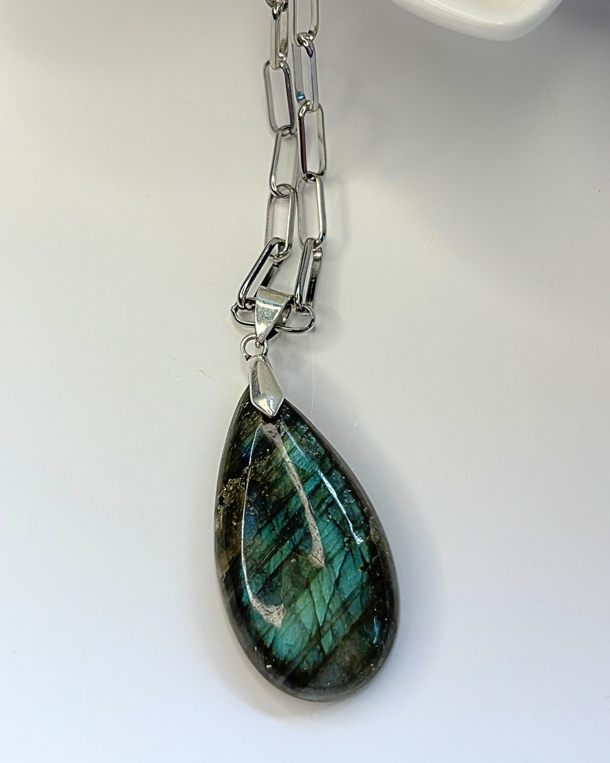 A pesar de lo que pueda parecer, este collar es liviano gracias a su cadena, la labradorita es conocida por su energía protectora y por potenciar la intuición y la claridad no en vano se la conoce como ¨la piedra de los magos¨