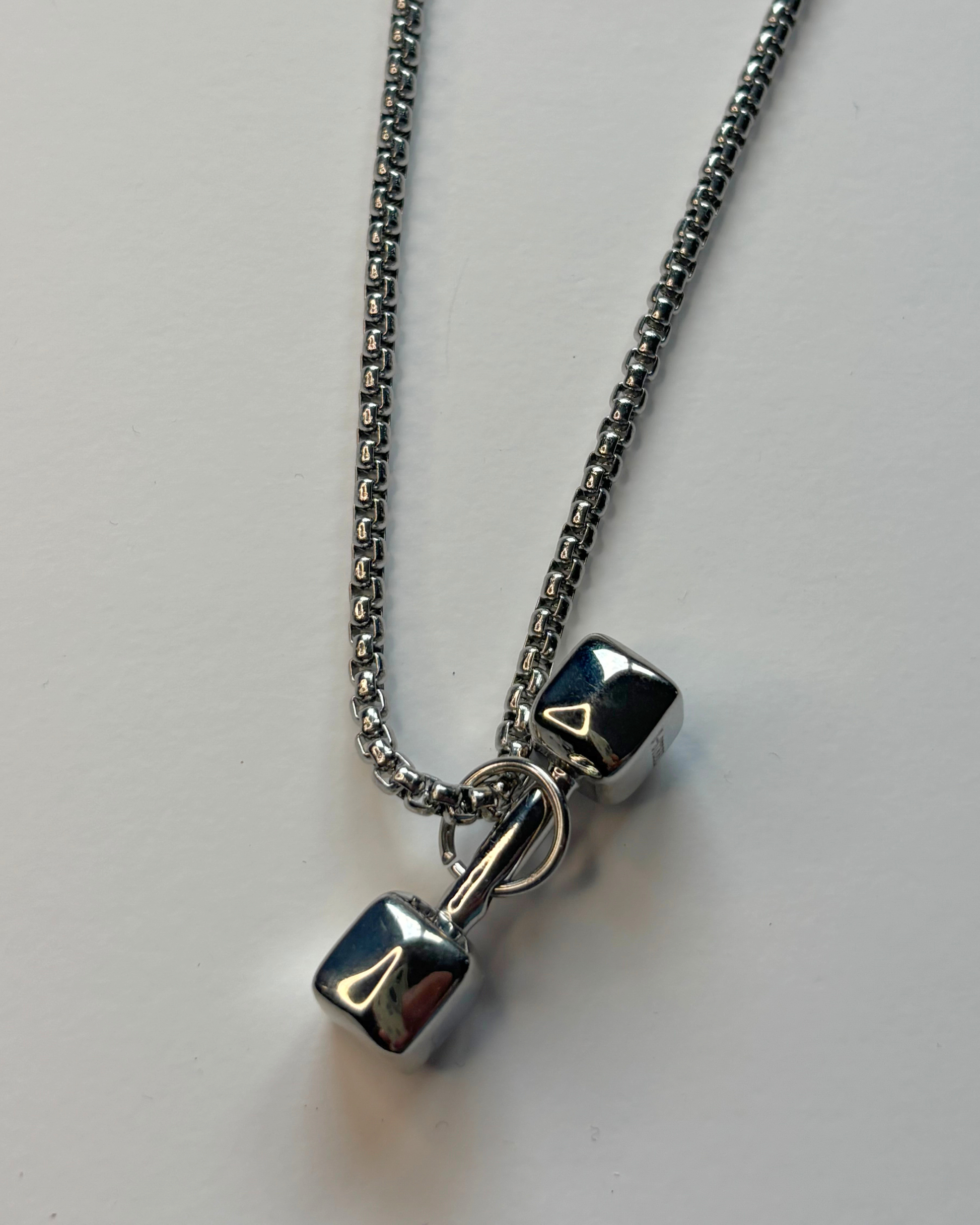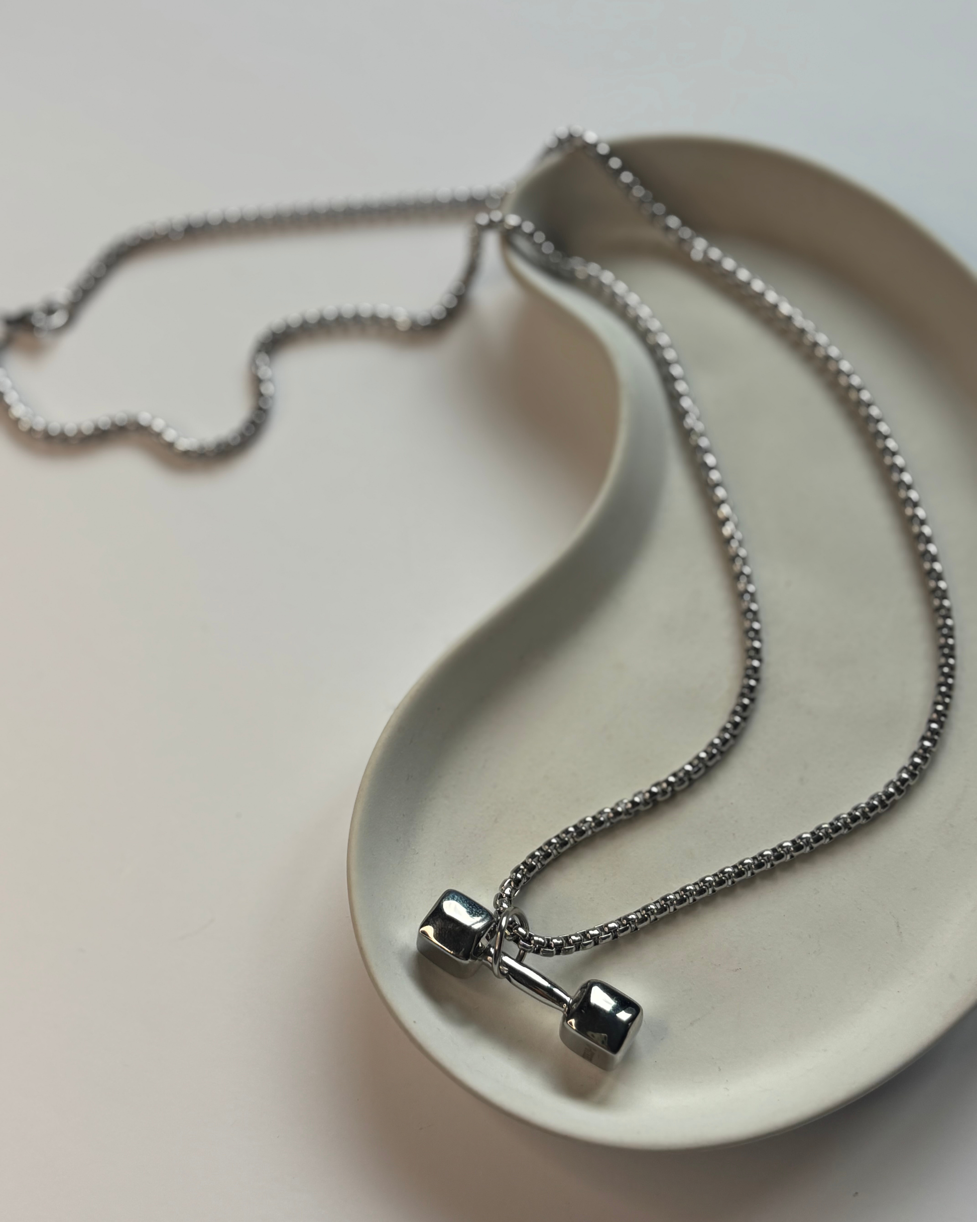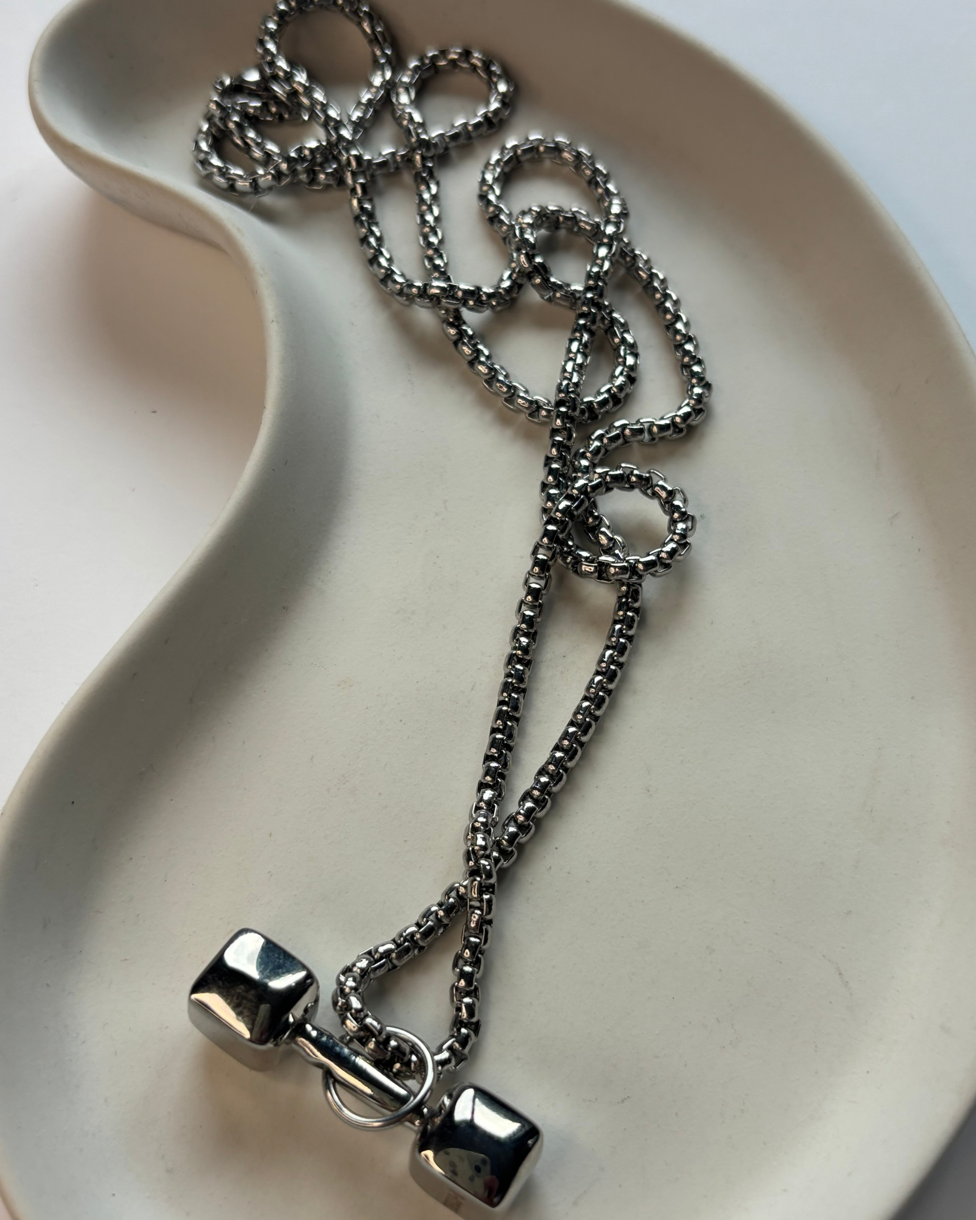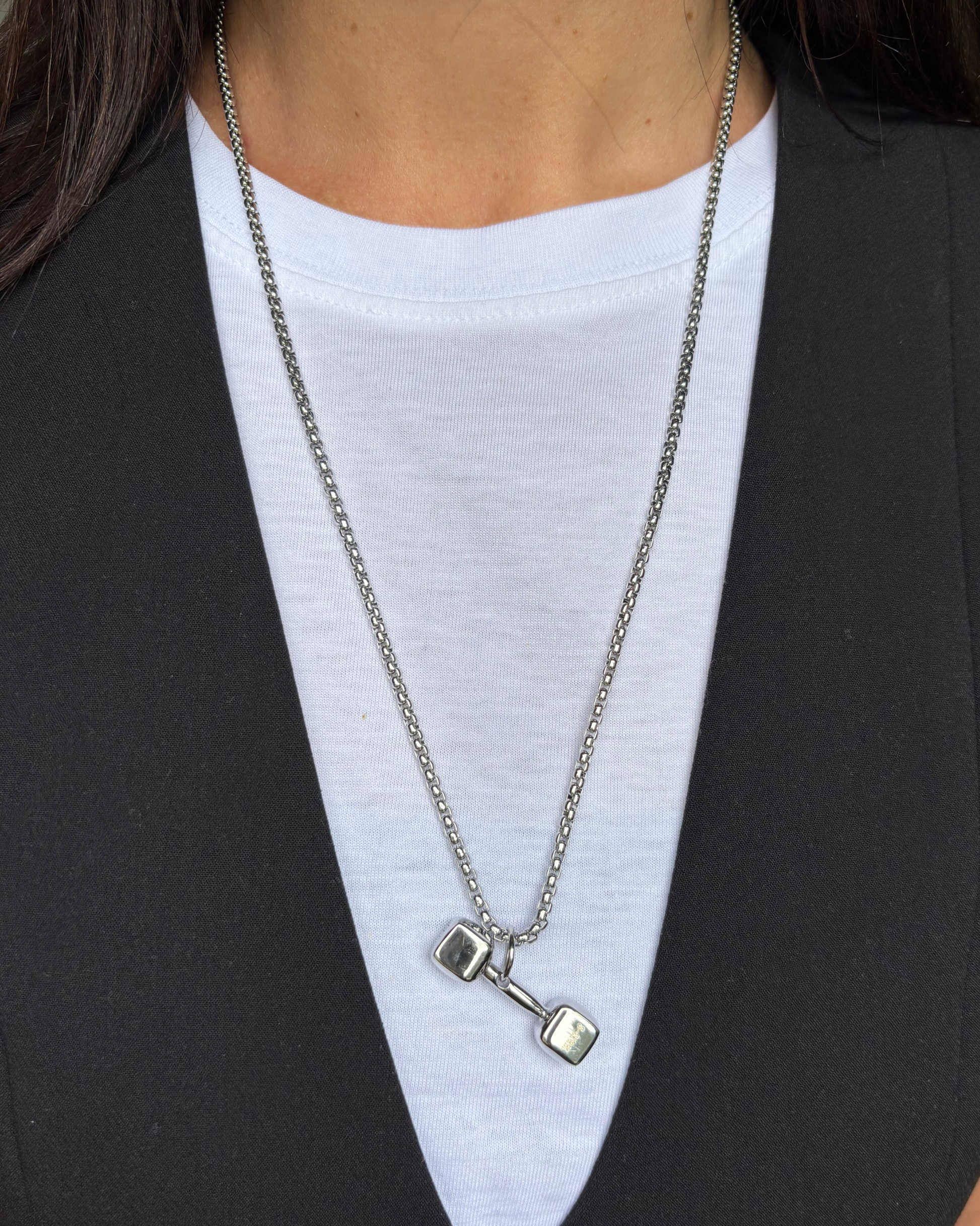 Collar de acero inoxidable largo con dije en forma de pesa, símbolo de disciplina, fuerza interior perseverancia y actitud en un accesorio moderno y duradero.