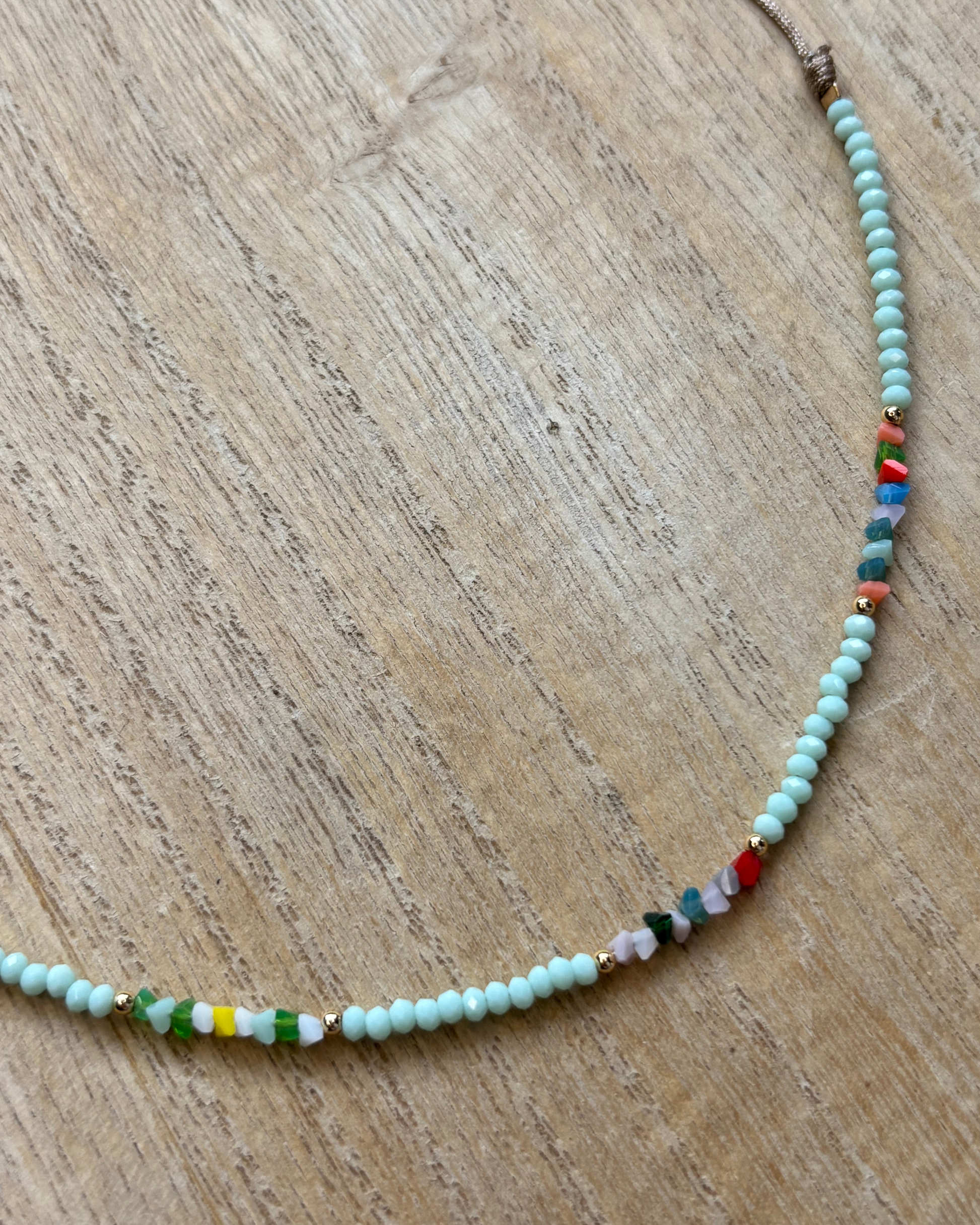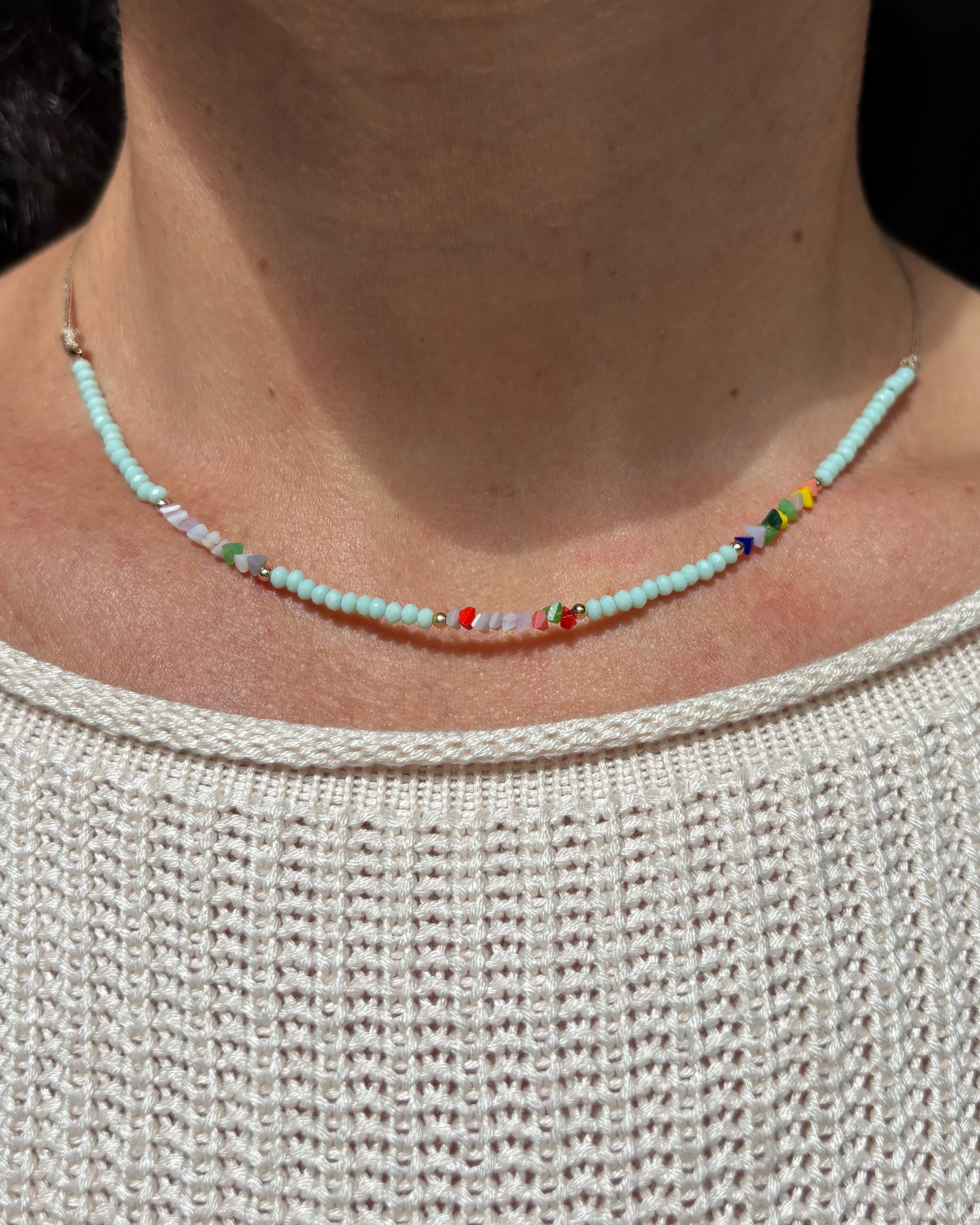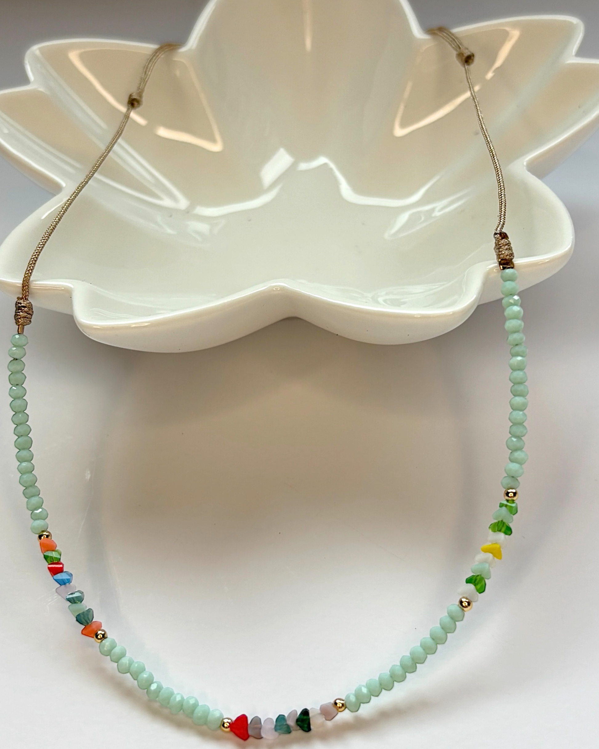 Collar de mostacillas en un color verde agua y mostacillas en varios colores y terminación en cordón en la parte trasera.