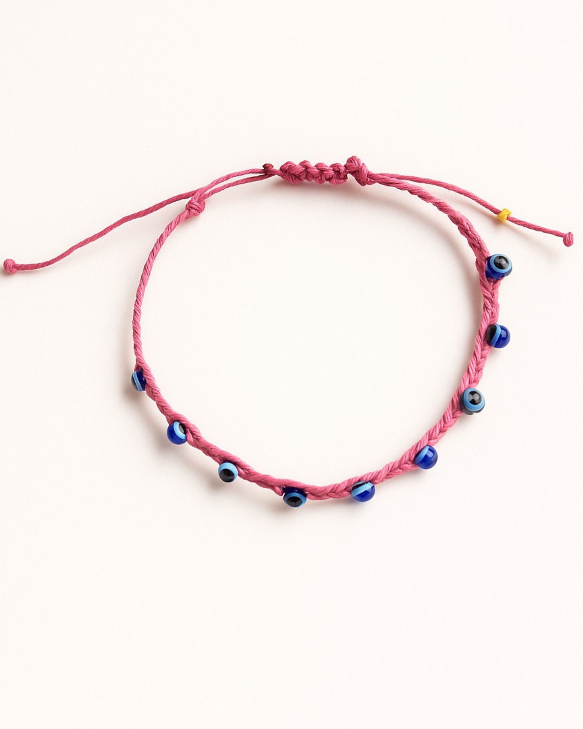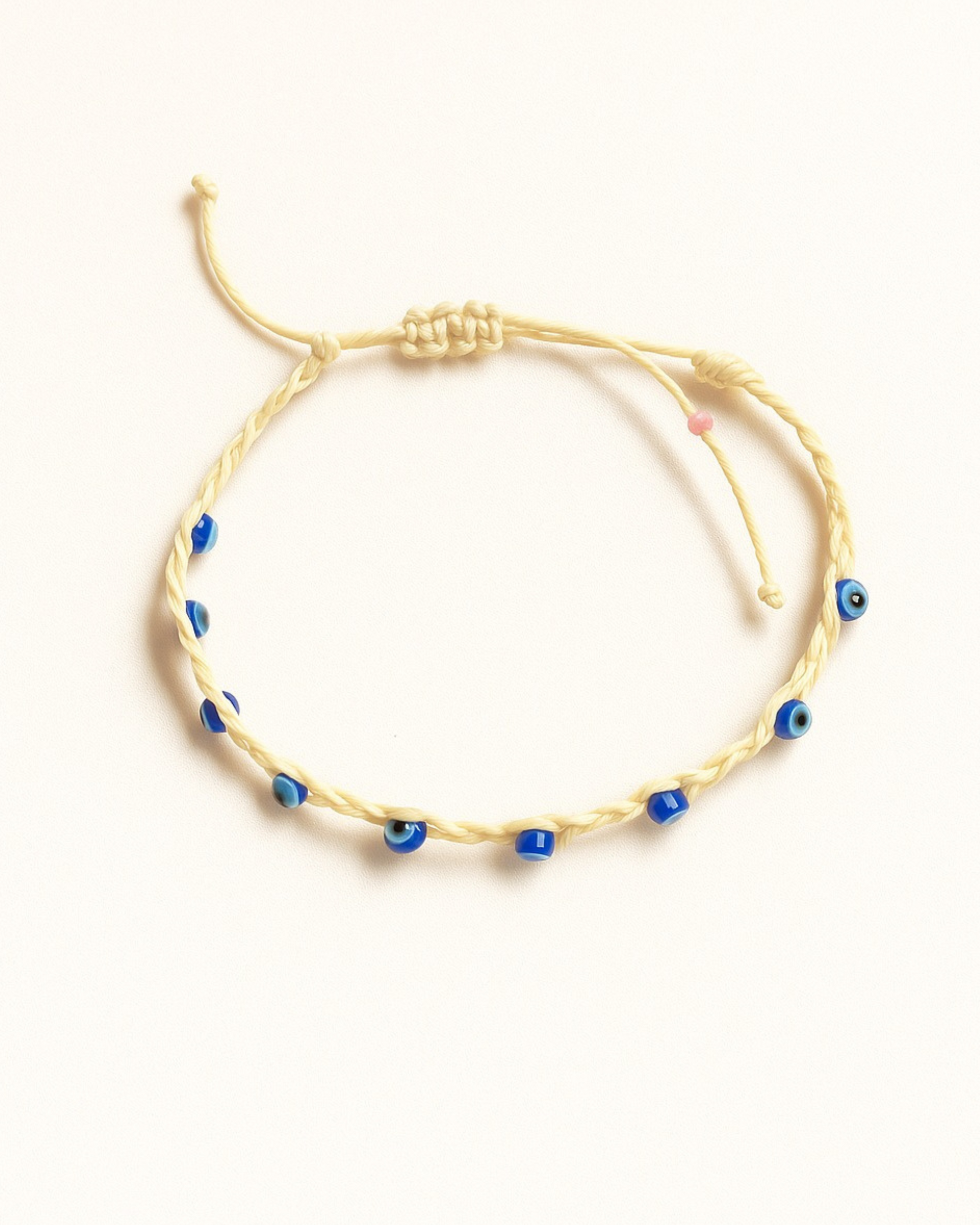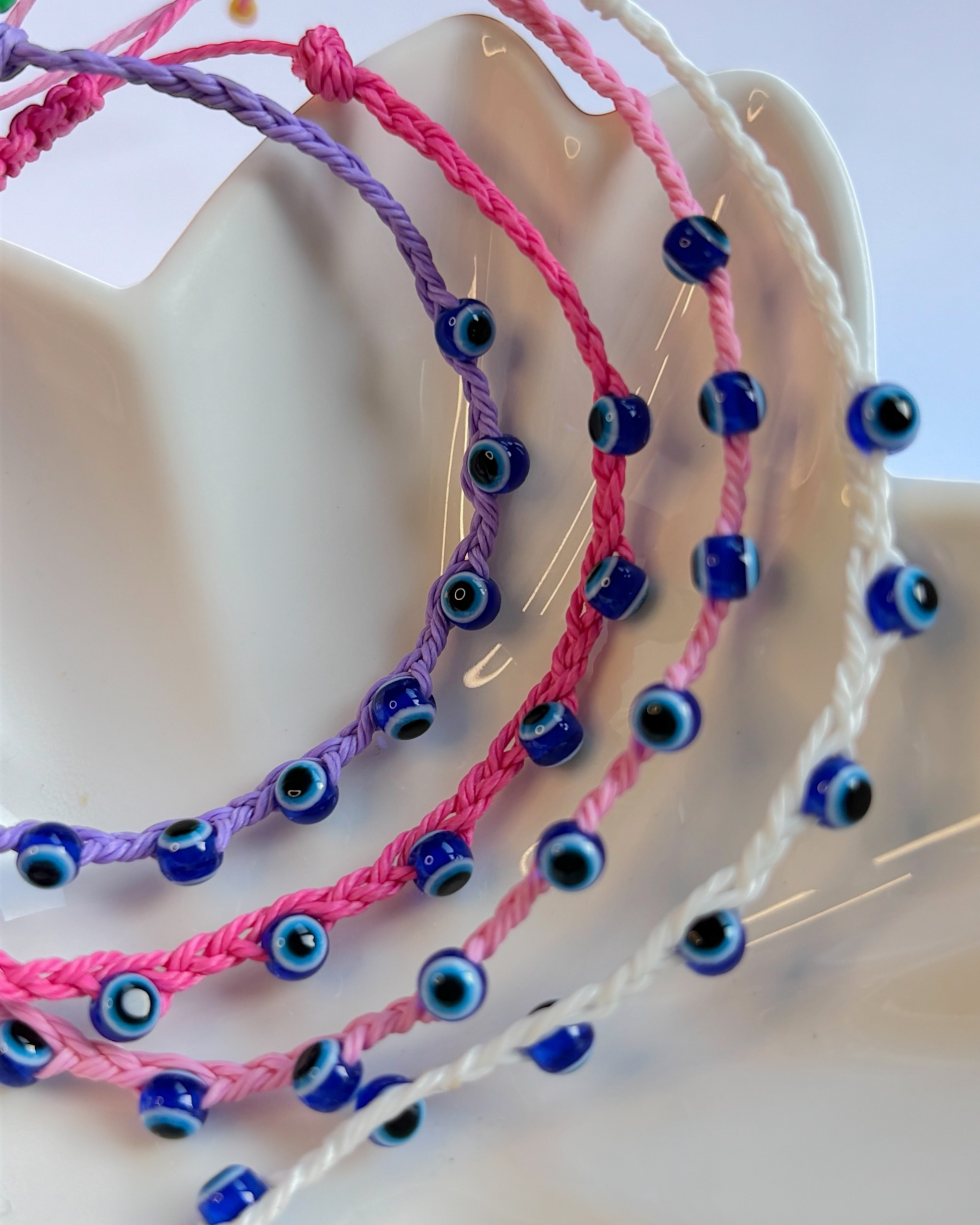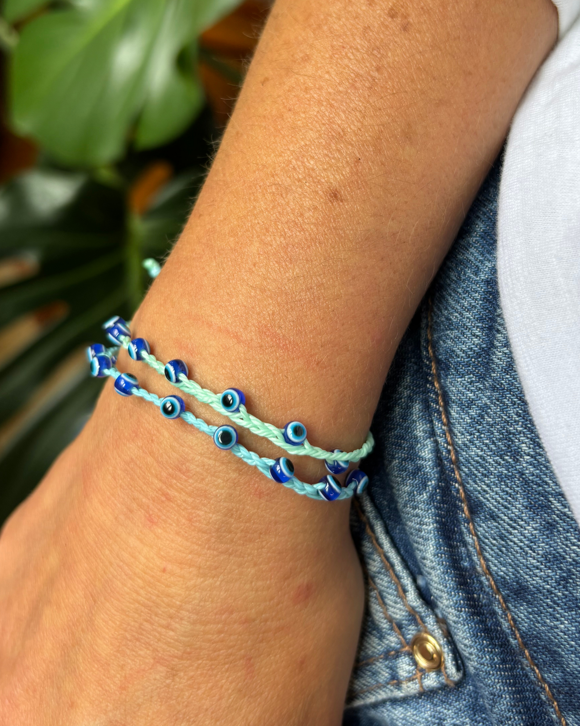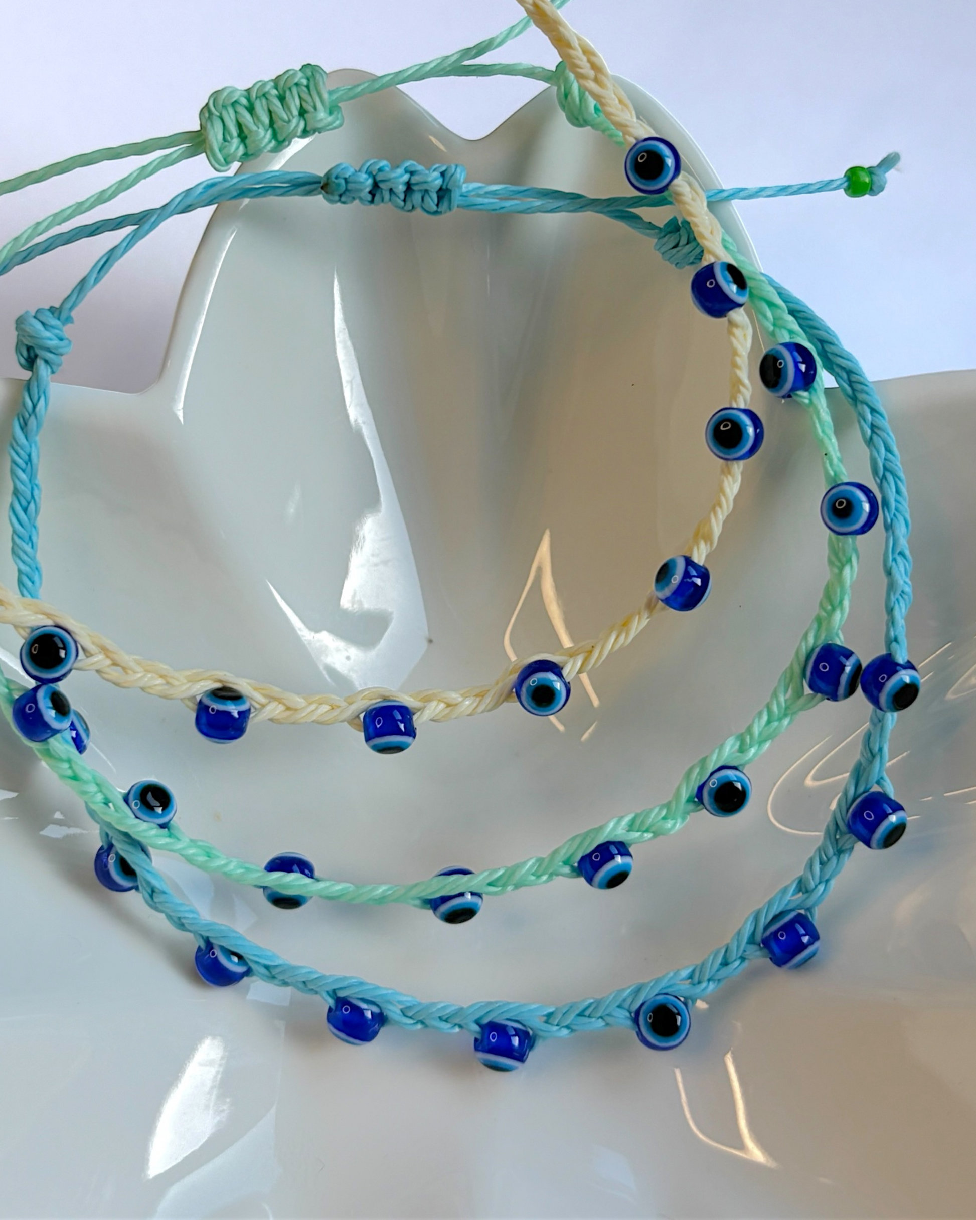 Pulseras de hilo encerado resistente en varios colores con ojitos turcos en azul.