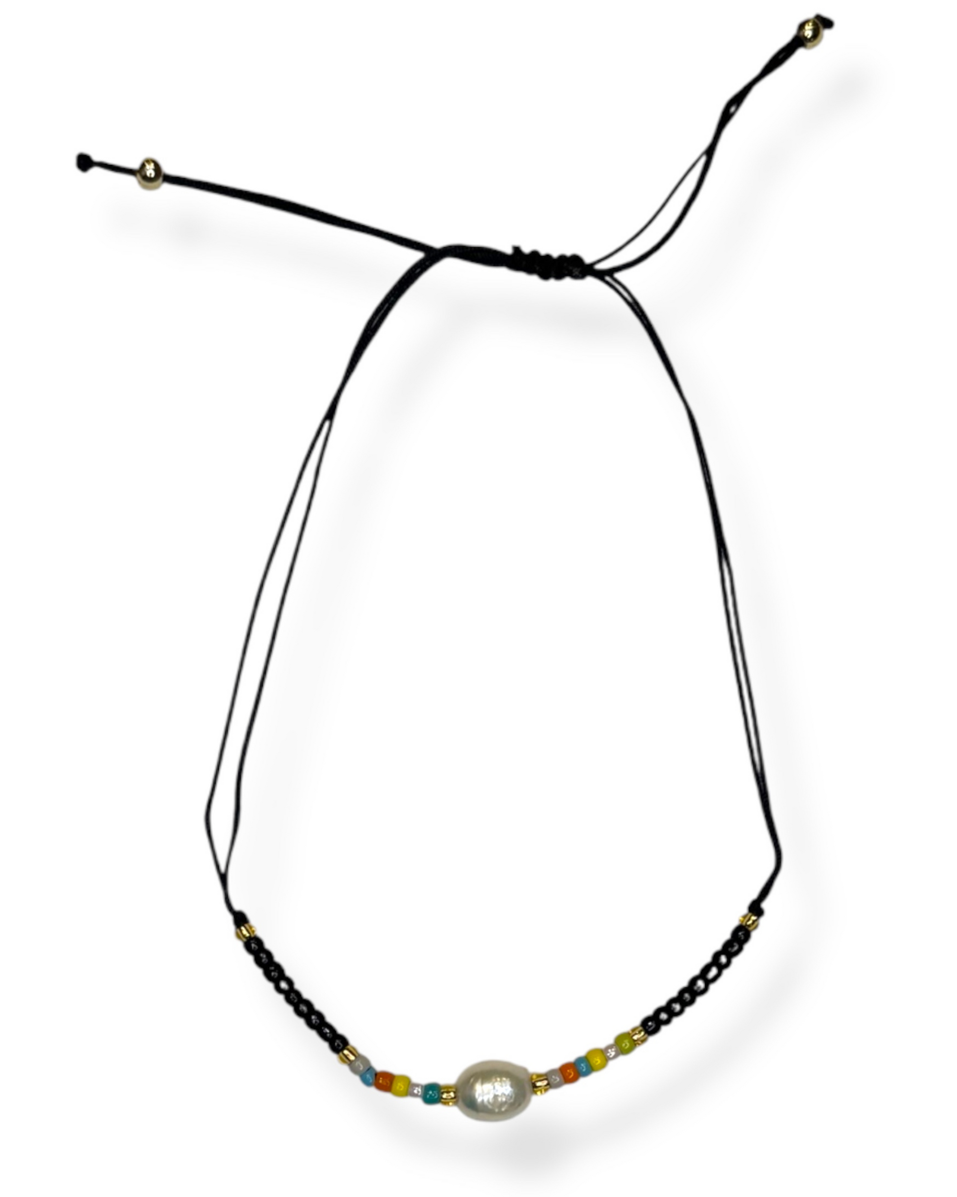 Pulsera ajustable elaborada con hilo negro, canutillos de colores y una perla como detalle central. Su diseño fino y versátil la convierte en una pieza ideal para usar sola, en conjunto o combinada con otras. Aporta un toque sutil de elegancia y color a cualquier estilo.