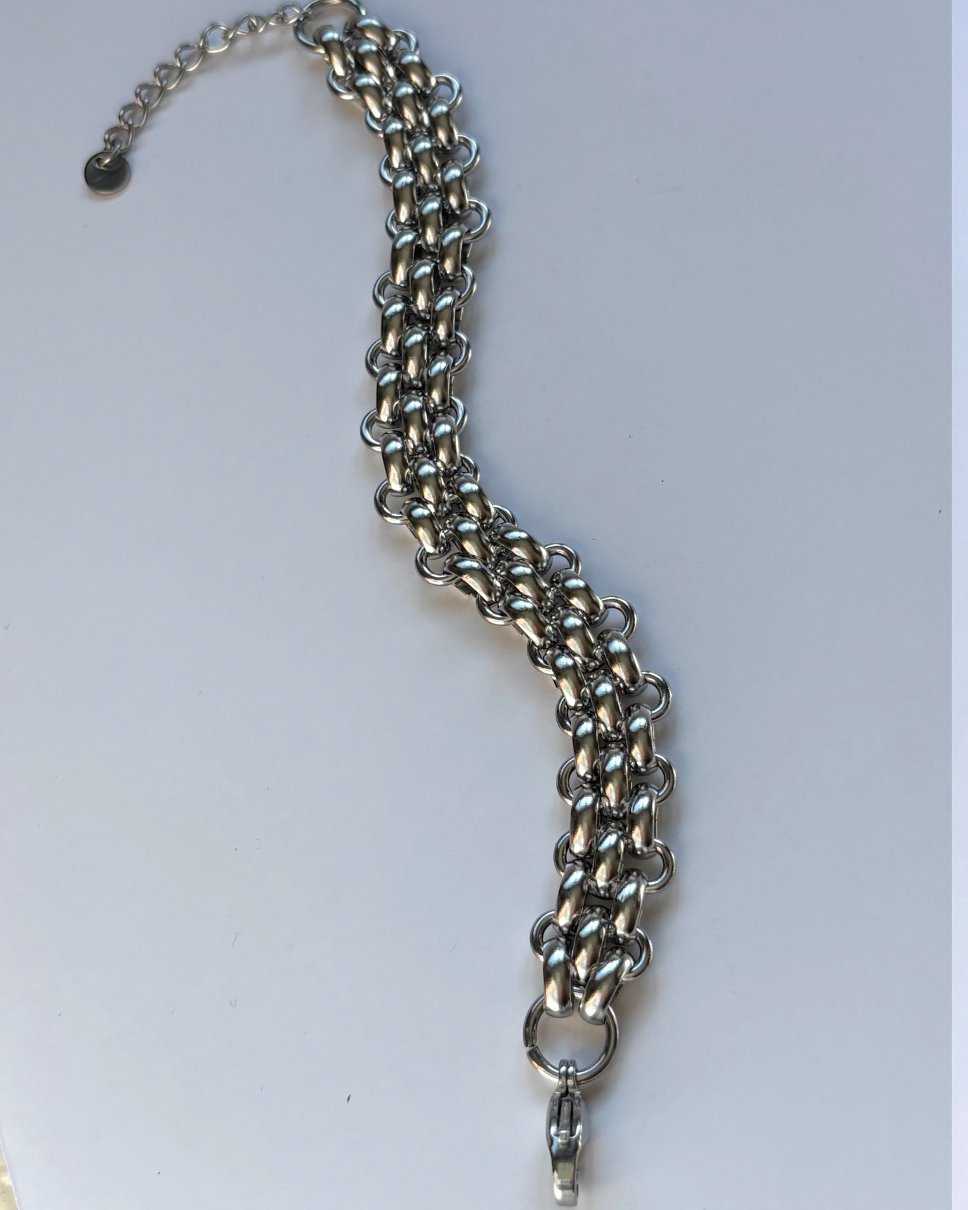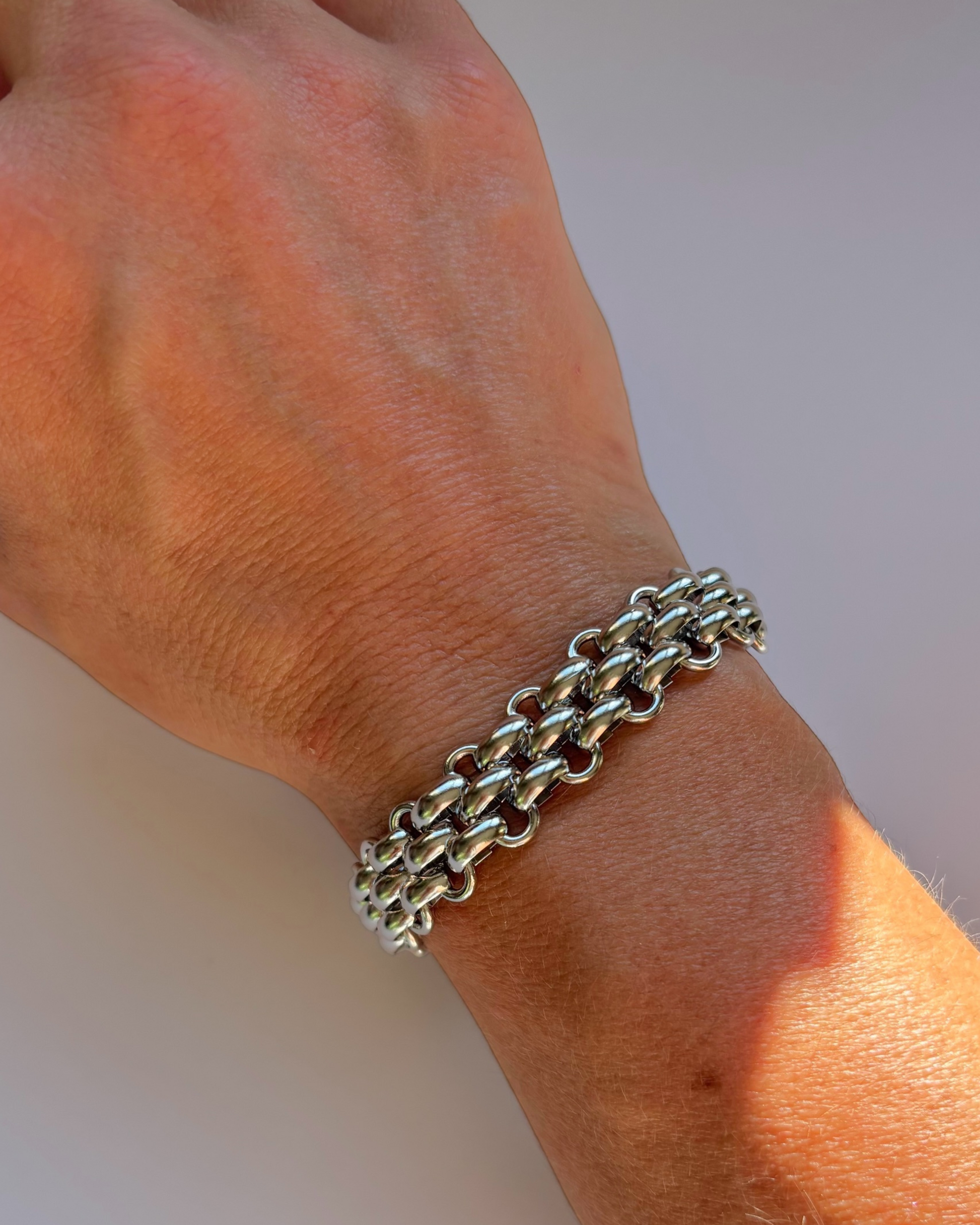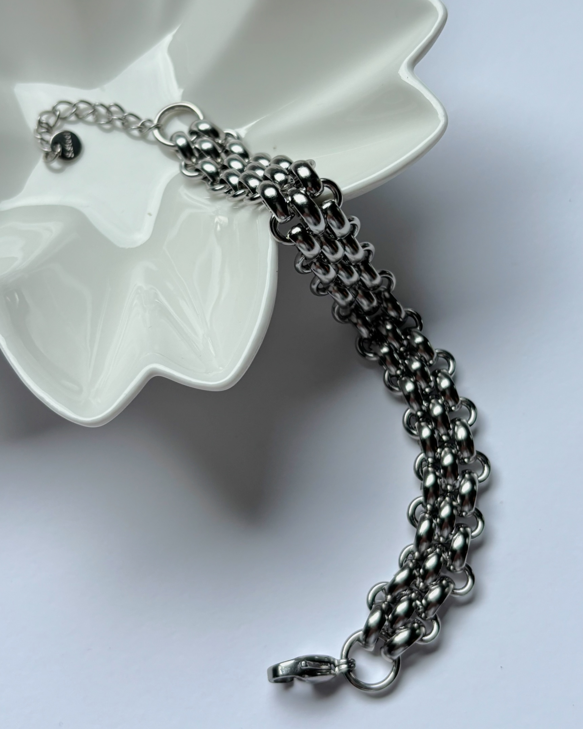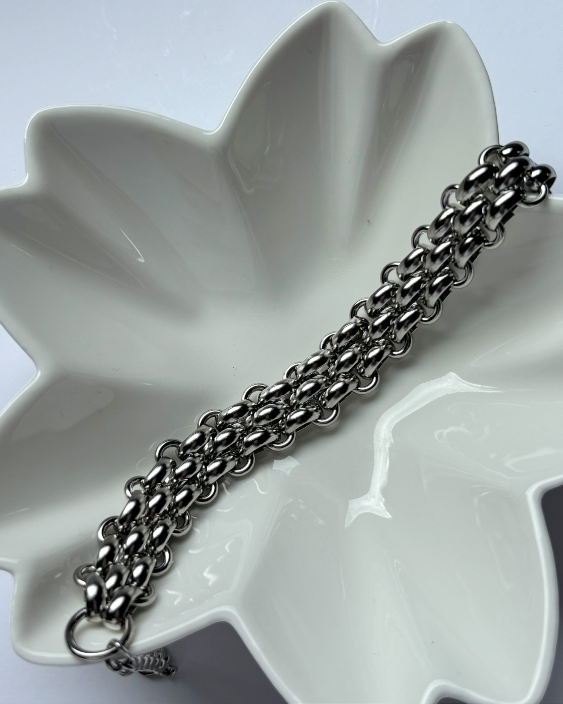 Pulsera en acero inoxidable de eslabones entrelazados doble fila que aportan un estilo moderno y sofisticado. Resistente, hipoalergénica y perfecta para uso diario.