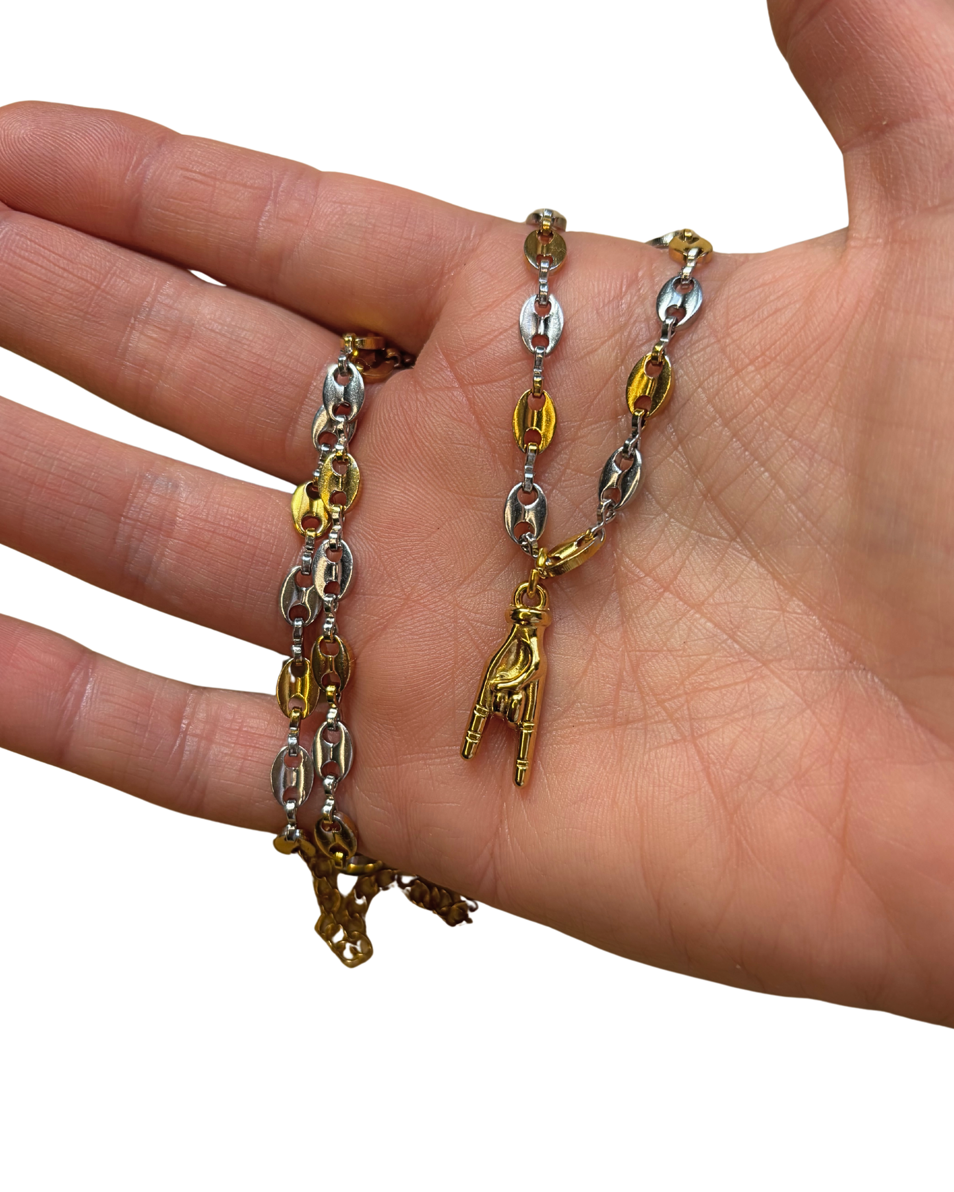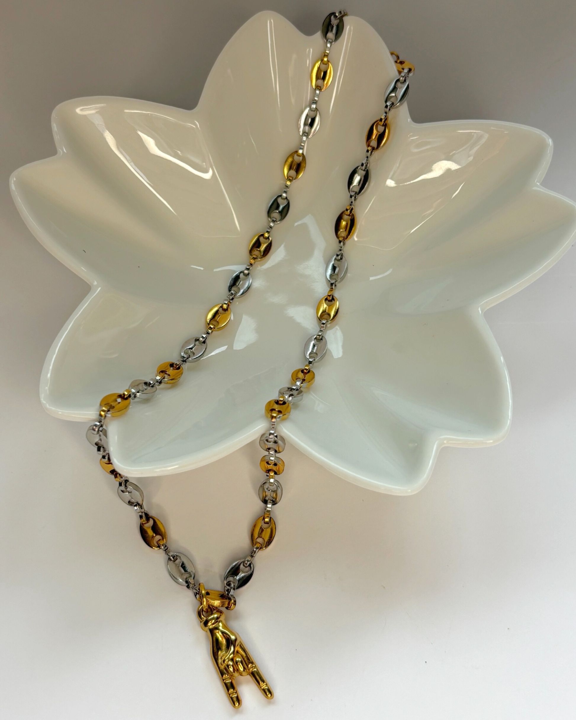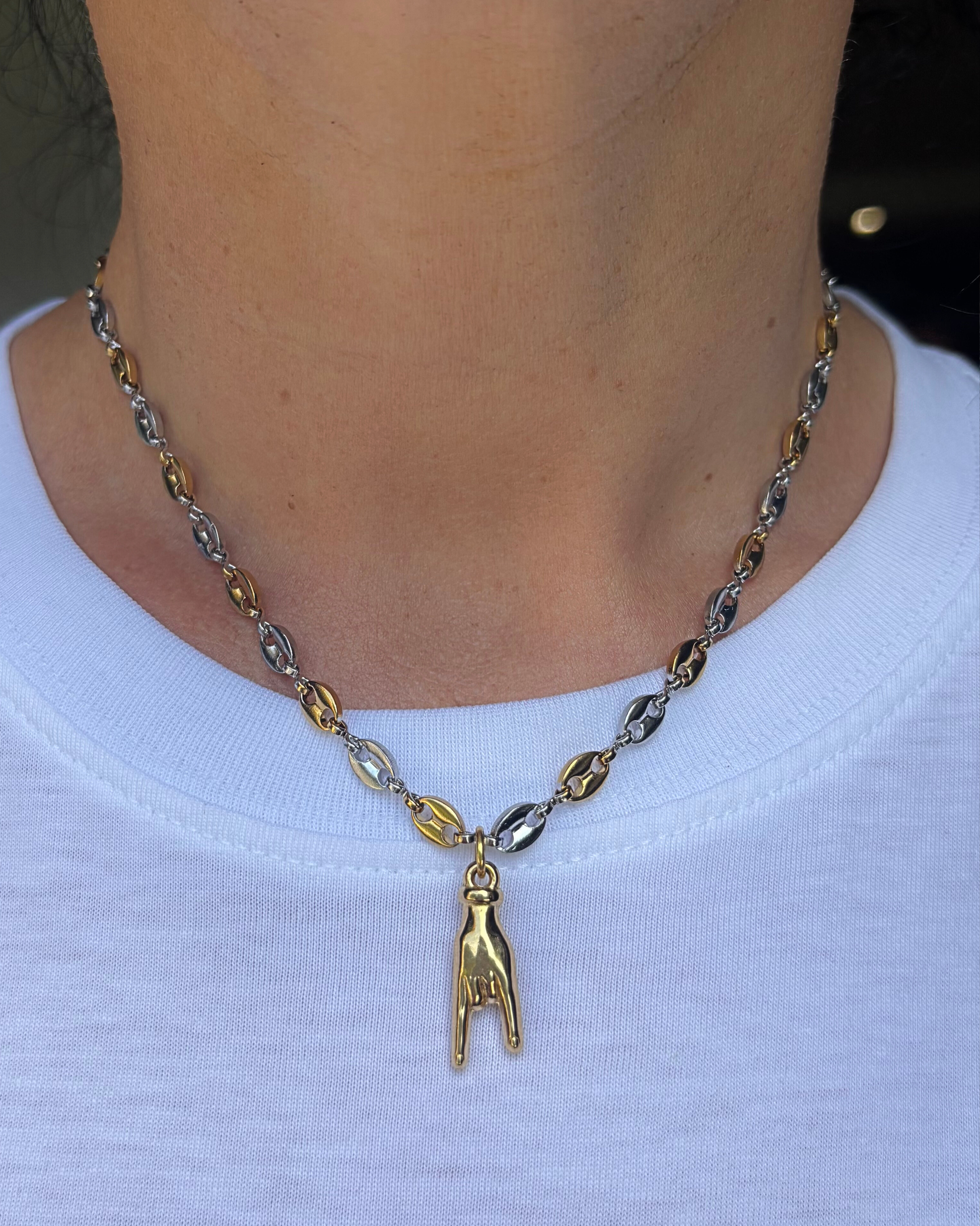 Actitud y estilo con este collar de acero inoxidable en dorado y plateado, combina elegancia con un toque moderno y audaz.