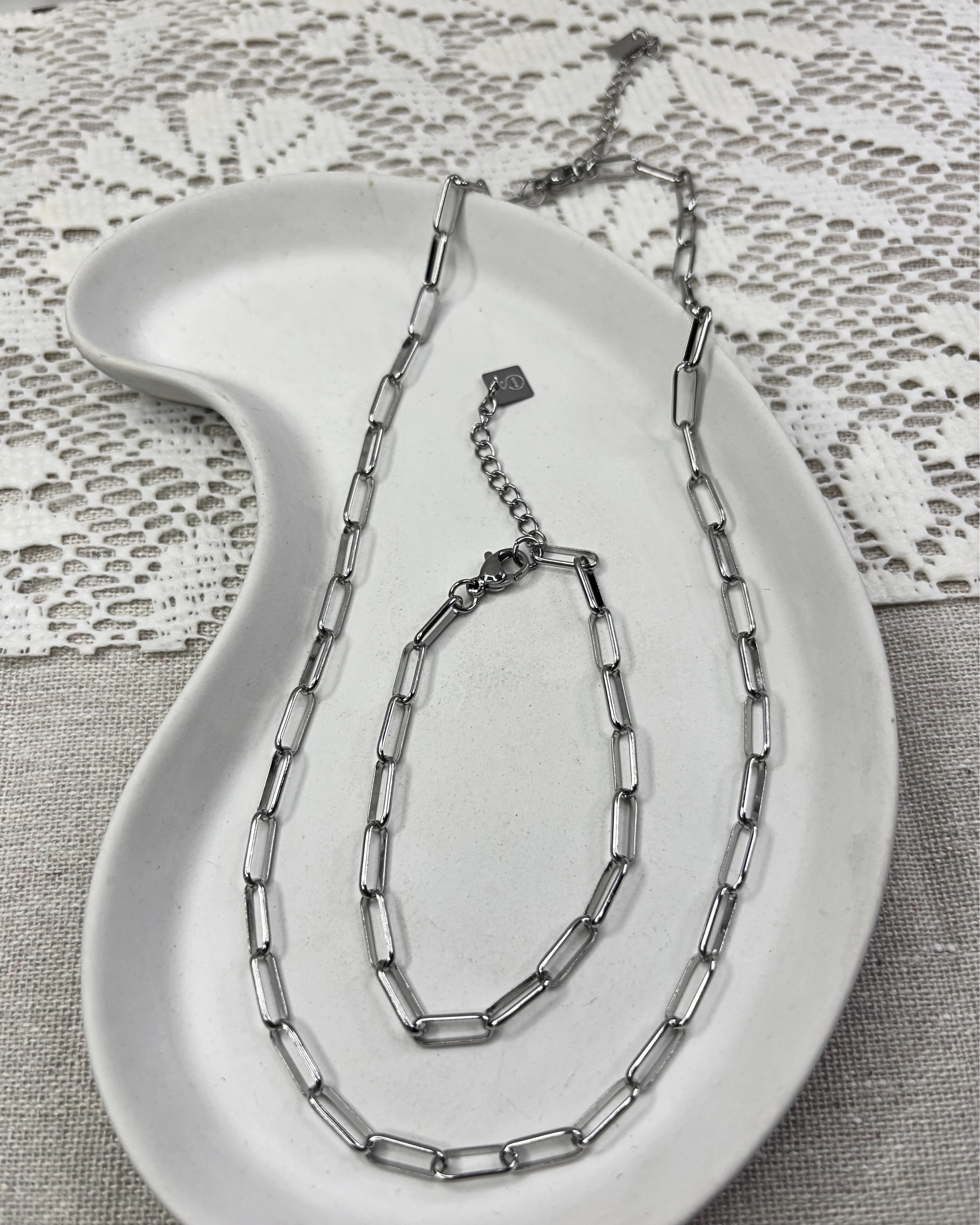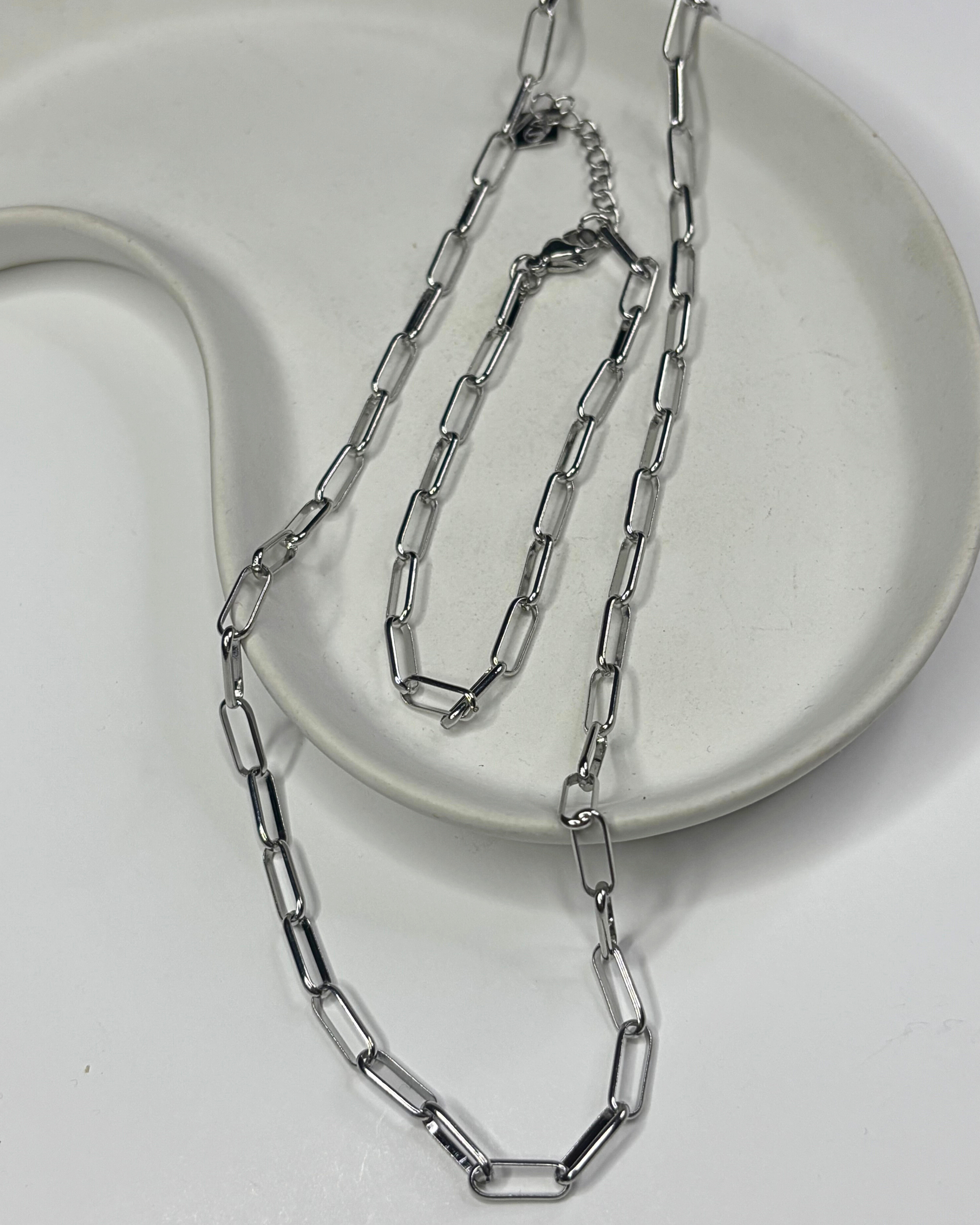 Set de collar + pulsera de acero inoxidable de eslabón tipo largo.