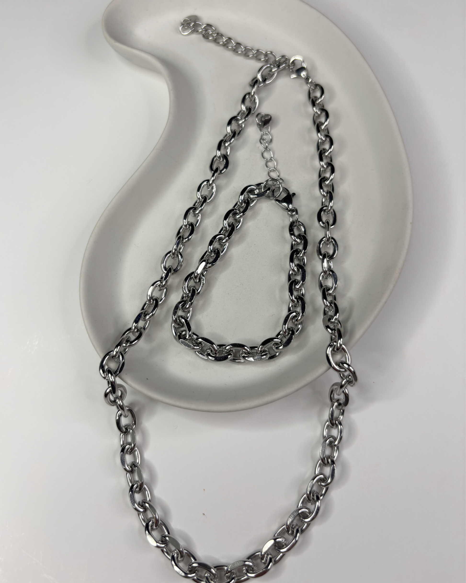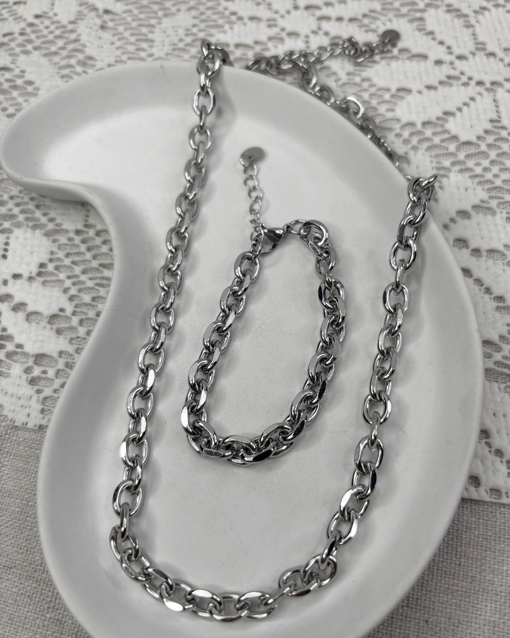 Set de collar y pulsera en acero inoxidable, de eslabones gruesos le a un look sofisticado y fuerte a tu look.