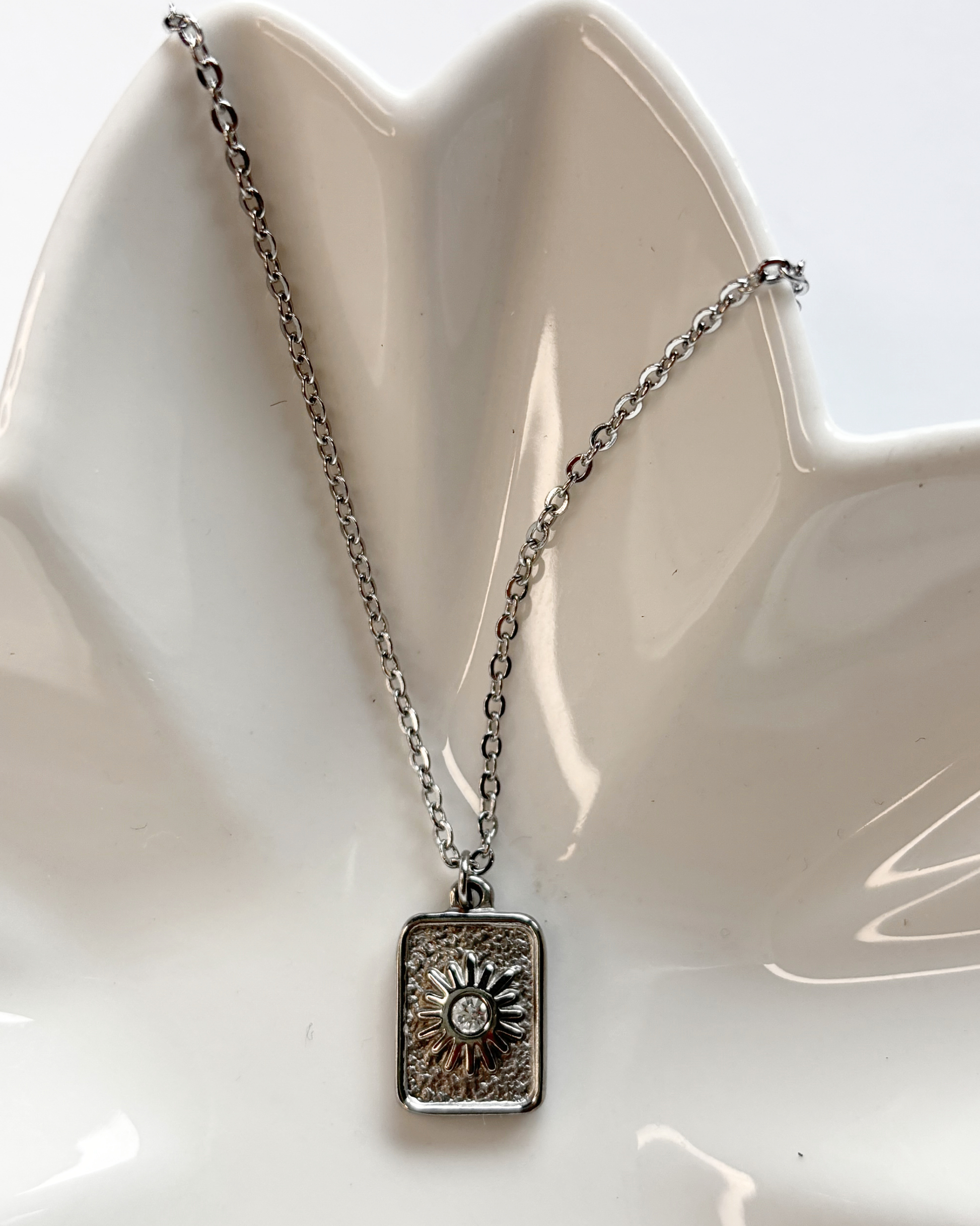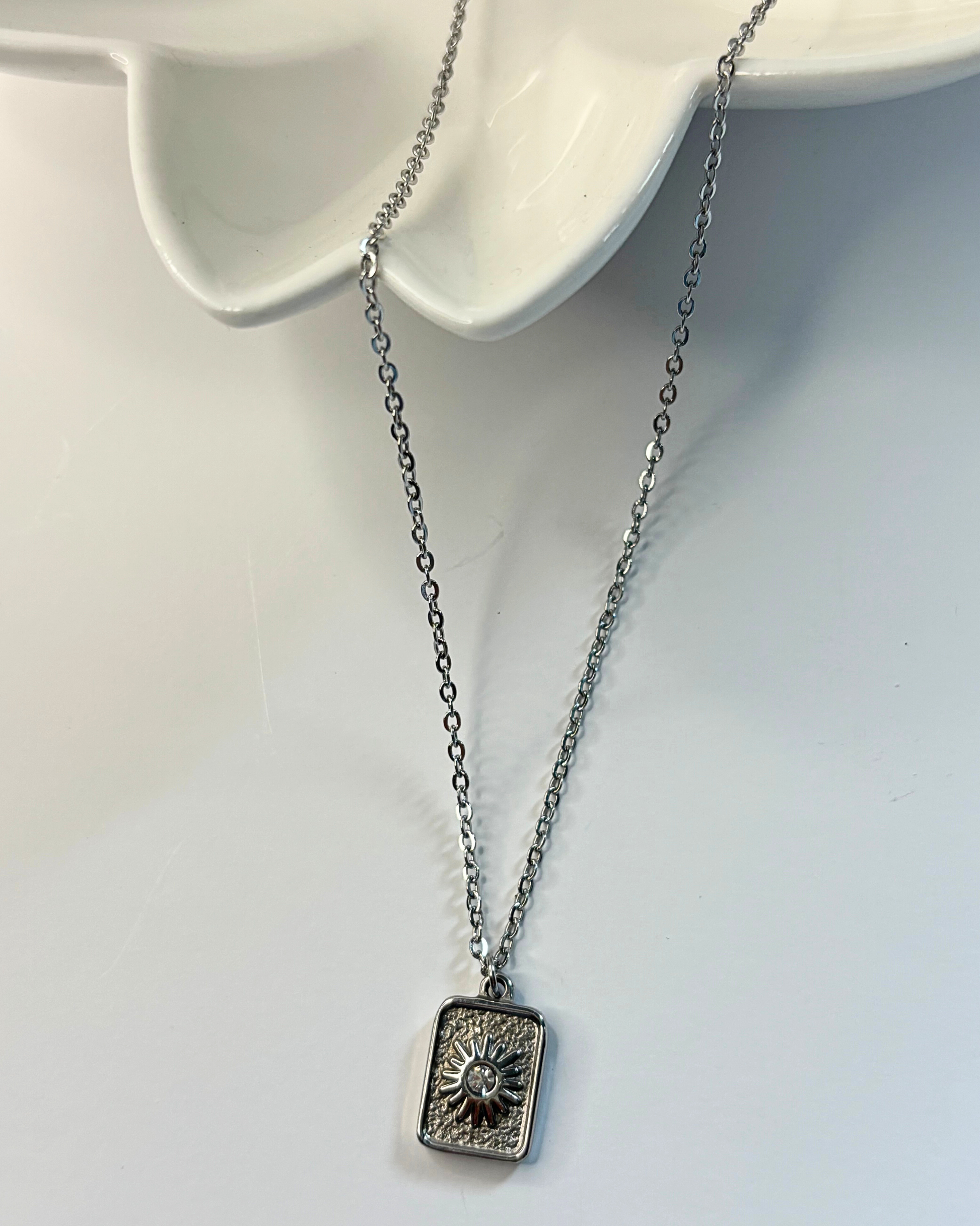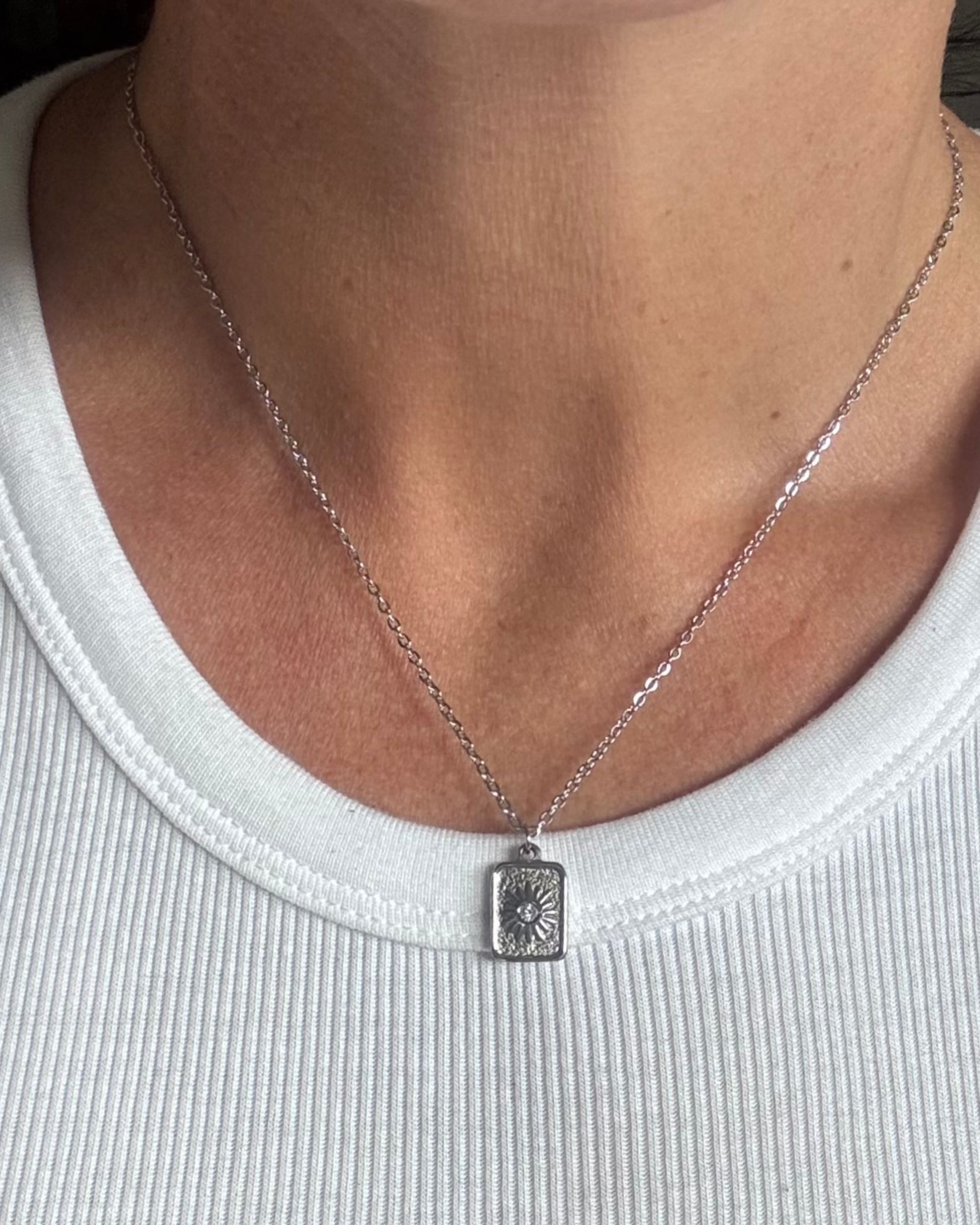 La fuerza del sol y el clásico del acero, collar simple, delicado y resistente para el dia a dia, el brillante le da ese toque sutil que realza este complemento.