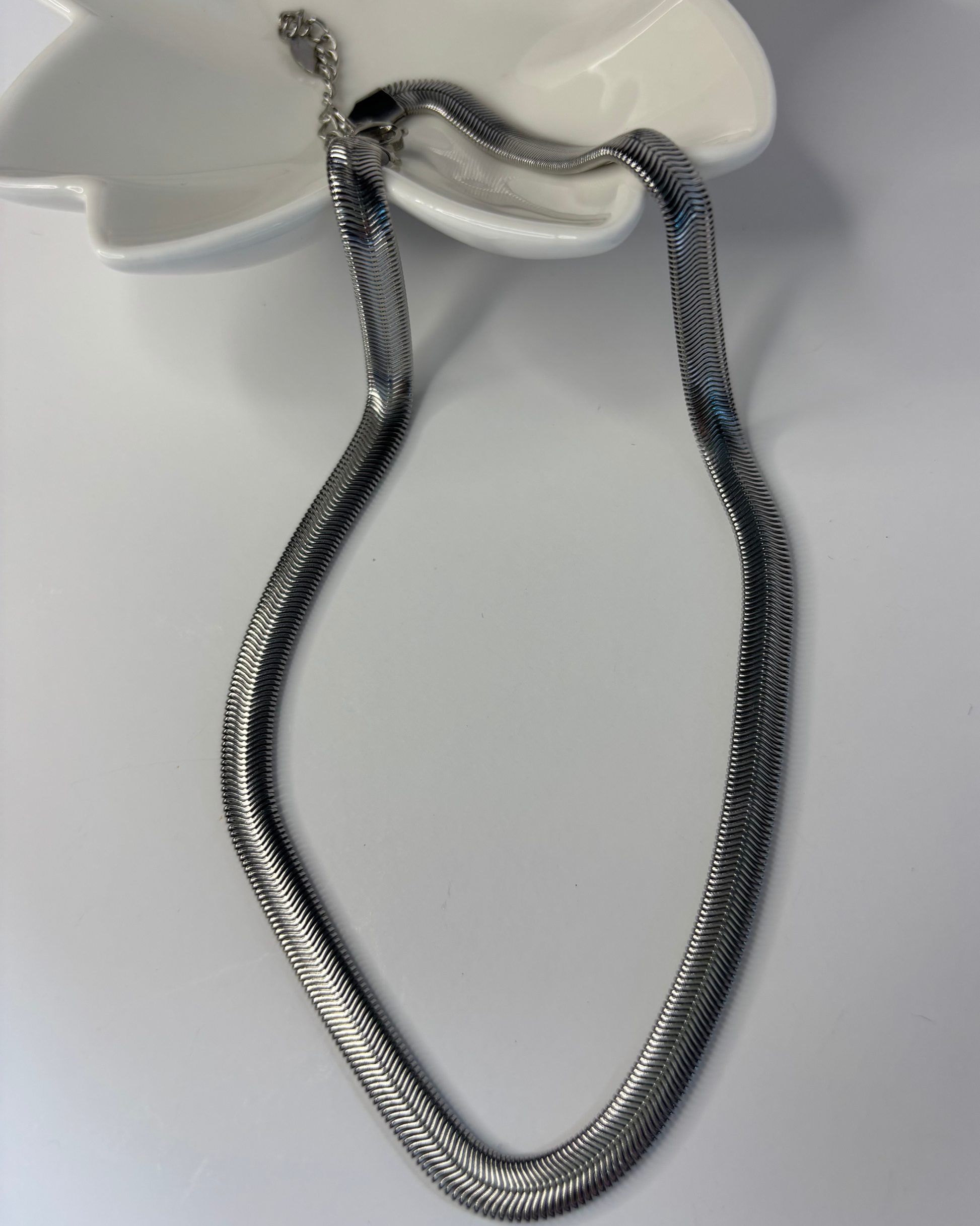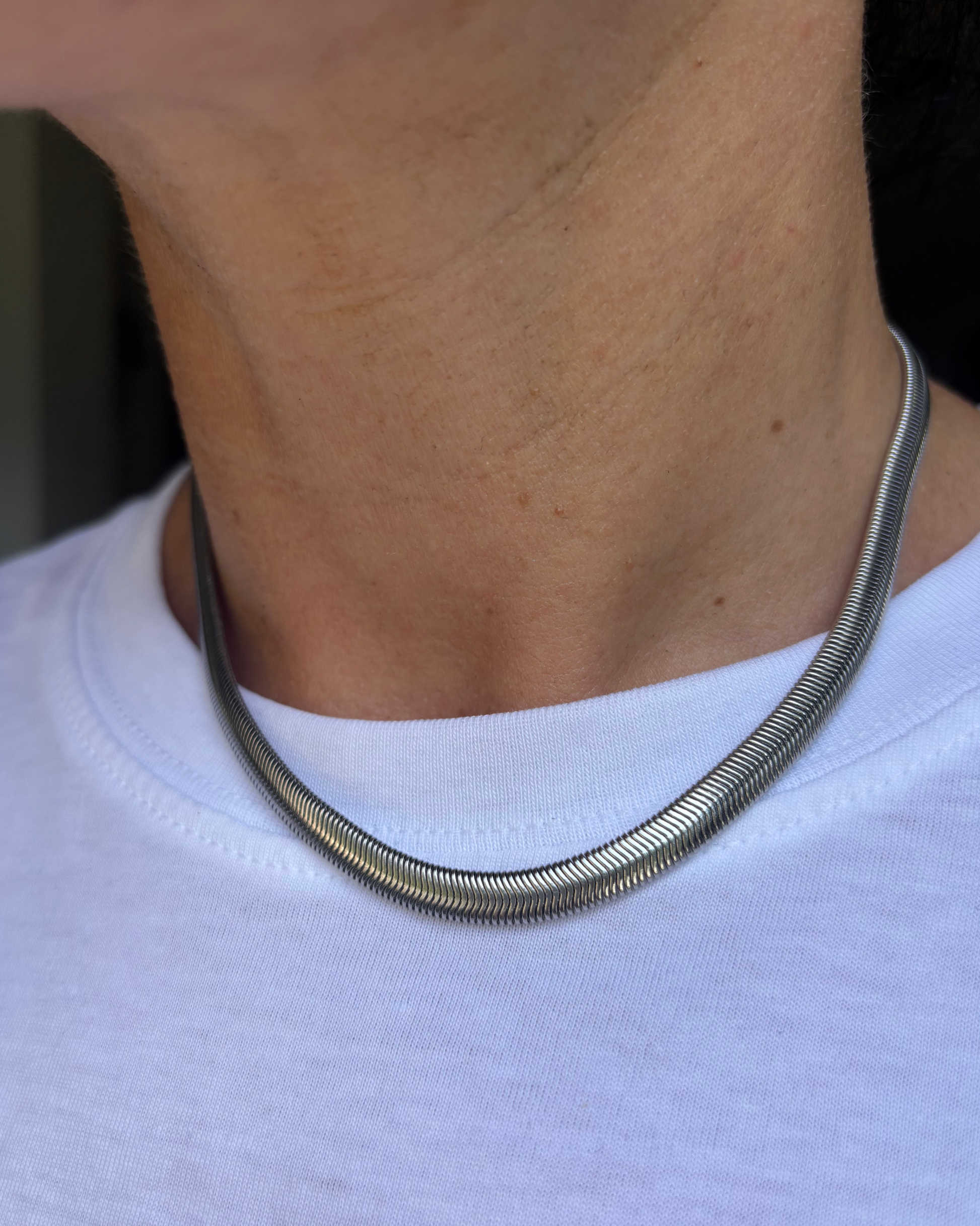 Moderno, elegante y con un toque de poder. Este collar de acero inoxidable destaca por su textura de piel de serpiente, brillante, suave y liviano.