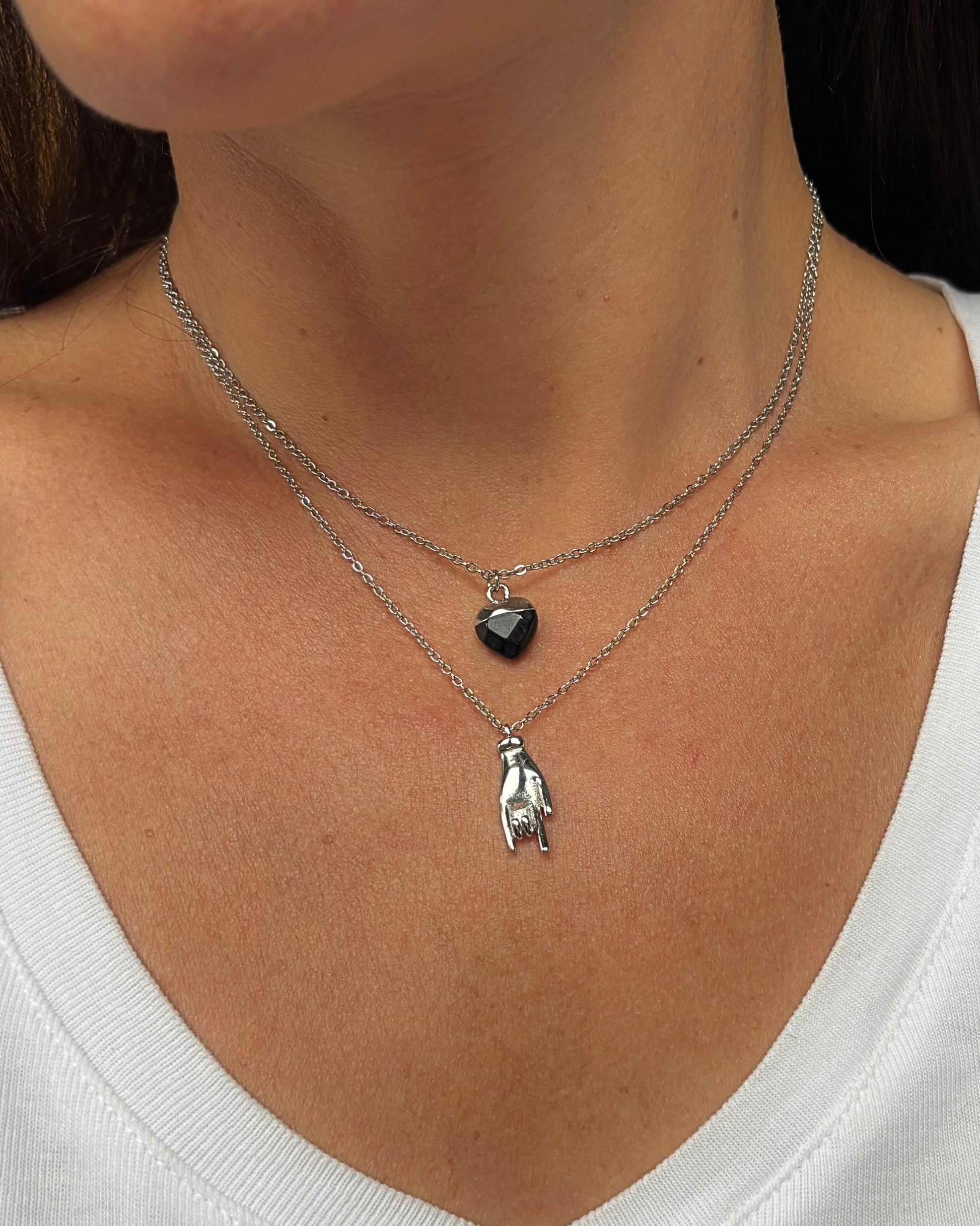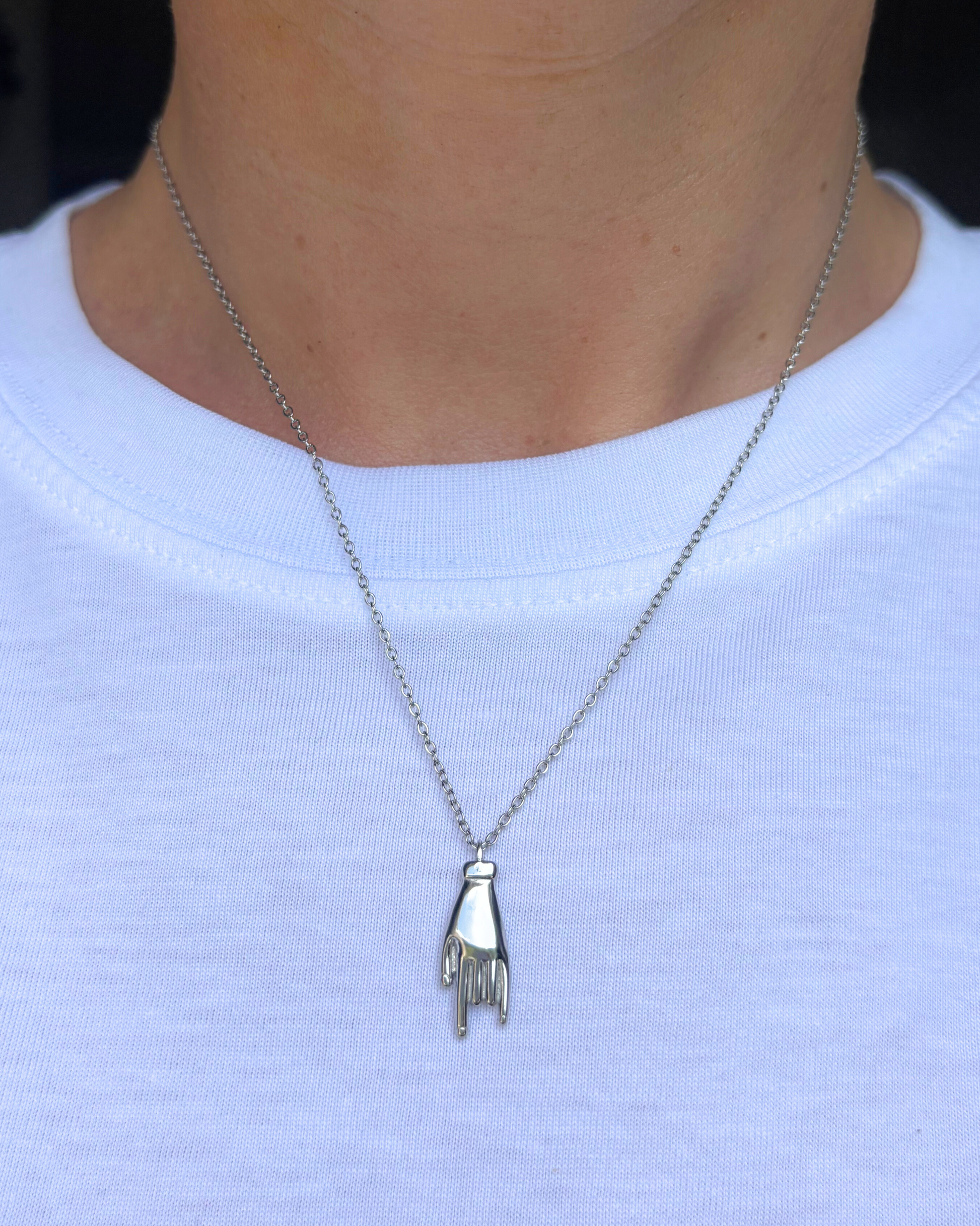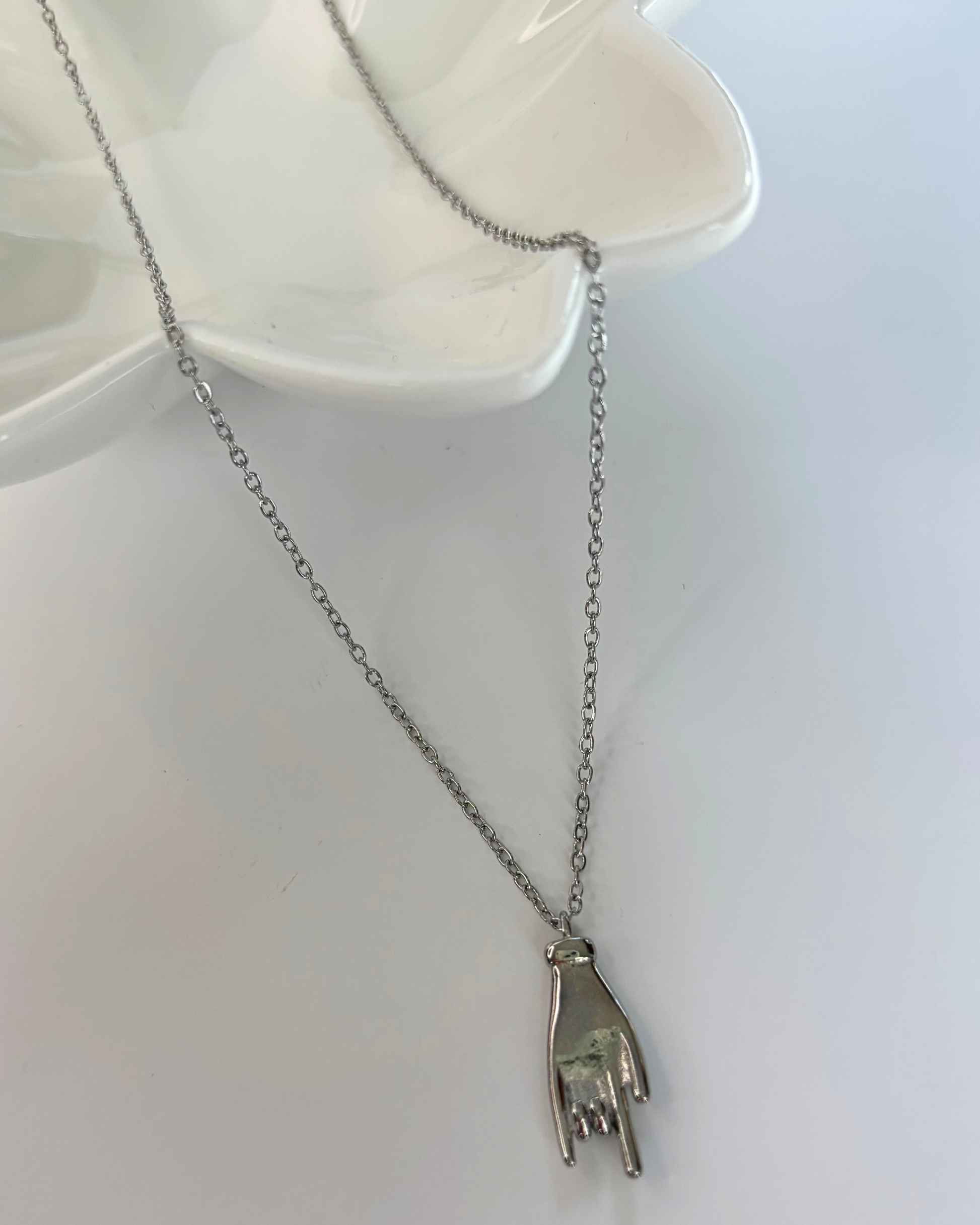 Un accesorio con personalidad y buena vibra, este collar de cadena fina de acero con dije de manito rockera es el símbolo perfecto de libertad, fuerza y autenticidad.